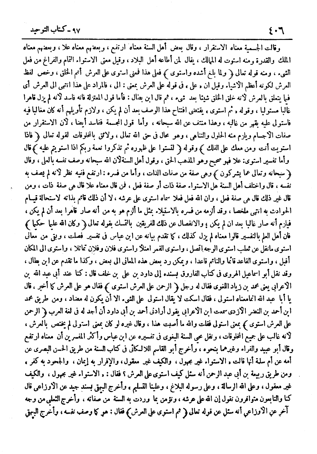 وَقَالَتِ الْجِسْمِيَّةُ مَعْنَاهُ الِاسْتِقْرَارُ وَقَالَ بَعْضُ أَهْلِ السُّنَّةِ مَعْنَاهُ ارْتَفَعَ وَبَعْضُهُمْ مَعْنَاهُ عَلَا وَبَعْضُهُمْ مَعْنَاهُ الْمُلْكُ وَالْقُدْرَةُ وَمِنْهُ اسْتَوَتْ لَهُ الْمَمَالِكُ يُقَالُ لِمَنْ أَطَاعَهُ أَهْلُ الْبِلَادِ وَقِيلَ مَعْنَى الِاسْتِوَاءِ التَّمَامُ وَالْفَرَاغُ مِنْ فِعْلِ الشَّيْءِ وَمِنْهُ قَوْله تَعَالَى وَلما بلغ أشده واستوى فَعَلَى هَذَا فَمَعْنَى اسْتَوَى عَلَى الْعَرْشِ أَتَمَّ الْخَلْقَ وَخَصَّ لَفْظَ الْعَرْشِ لِكَوْنِهِ أَعْظَمَ الْأَشْيَاءِ وَقِيلَ إِنَّ عَلَى فِي قَوْلِهِ عَلَى الْعَرْشِ بِمَعْنَى إِلَى فَالْمُرَادُ عَلَى هَذَا انْتَهَى إِلَى الْعَرْشِ أَيْ فِيمَا يَتَعَلَّقُ بِالْعَرْشِ لِأَنَّهُ خَلَقَ الْخلق شَيْئا بعد شَيْء ثمَّ قَالَ بن بَطَّالٍ فَأَمَّا قَوْلُ الْمُعْتَزِلَةِ فَإِنَّهُ فَاسِدٌ لِأَنَّهُ لَمْ يَزَلْ قَاهِرًا غَالِبًا مُسْتَوْلِيًا وَقَوْلُهُ ثُمَّ اسْتَوَى يَقْتَضِي افْتِتَاحَ هَذَا الْوَصْفِ بَعْدَ أَنْ لَمْ يَكُنْ وَلَازِمُ تَأْوِيلِهِمْ أَنَّهُ كَانَ مُغَالَبًا فِيهِ فَاسْتَوْلَى عَلَيْهِ بِقَهْرِ مَنْ غَالَبَهُ وَهَذَا مُنْتَفٍ عَنِ اللَّهِ سُبْحَانَهُ وَأَمَّا قَوْلُ الْمُجَسِّمَةِ فَفَاسِدٌ أَيْضًا لِأَنَّ الِاسْتِقْرَارَ مِنْ صِفَاتِ الْأَجْسَامِ وَيَلْزَمُ مِنْهُ الْحُلُولُ وَالتَّنَاهِي وَهُوَ مُحَالٌ فِي حَقِّ اللَّهِ تَعَالَى وَلَائِقٌ بِالْمَخْلُوقَاتِ لِقَوْلِهِ تَعَالَى فَإِذَا استويت أَنْت وَمن مَعَك على الْفلك وَقَوْلُهُ لِتَسْتَوُوا عَلَى ظُهُورِهِ ثُمَّ تَذْكُرُوا نِعْمَةَ رَبِّكُمْ إِذا اسْتَوَيْتُمْ عَلَيْهِ قَالَ وَأَمَّا تَفْسِيرُ اسْتَوَى عَلَا فَهُوَ صَحِيحٌ وَهُوَ الْمَذْهَبُ الْحَقُّ وَقَوْلُ أَهْلِ السُّنَّةِ لِأَنَّ اللَّهَ سُبْحَانَهُ وَصَفَ نَفْسَهُ بِالْعُلَى وَقَالَ سُبْحَانَهُ وَتَعَالَى عَمَّا يشركُونَ وَهِيَ صِفَةٌ مِنْ صِفَاتِ الذَّاتِ وَأَمَّا مَنْ فَسَّرَهُ ارْتَفَعَ فَفِيهِ نَظَرٌ لِأَنَّهُ لَمْ يَصِفْ بِهِ نَفْسَهُ قَالَ وَاخْتَلَفَ أَهْلُ السُّنَّةِ هَلِ الِاسْتِوَاءُ صِفَةُ ذَاتٍ أَوْ صِفَةُ فِعْلٍ فَمَنْ قَالَ مَعْنَاهُ عَلَا قَالَ هِيَ صِفَةُ ذَاتٍ وَمَنْ قَالَ غَيْرَ ذَلِكَ قَالَ هِيَ صِفَةُ فِعْلٍ وَإِنَّ اللَّهَ فَعَلَ فِعْلًا سَمَّاهُ اسْتَوَى عَلَى عَرْشِهِ لَا أَنَّ ذَلِكَ قَائِمٌ بِذَاتِهِ لِاسْتِحَالَةِ قِيَامِ الْحَوَادِثِ بِهِ انْتَهَى مُلَخَّصًا وَقَدْ أَلْزَمَهُ مَنْ فَسَّرَهُ بِالِاسْتِيلَاءِ بِمِثْلِ مَا أَلْزَمَ هُوَ بِهِ مِنْ أَنَّهُ صَارَ قَاهِرًا بَعْدَ أَنْ لَمْ يَكُنْ فَيَلْزَمُ أَنَّهُ صَارَ غَالِبًا بَعْدَ أَنْ لَمْ يَكُنْ وَالِانْفِصَالُ عَنْ ذَلِكَ لِلْفَرِيقَيْنِ بِالتَّمَسُّكِ بِقَوْلِهِ تَعَالَى وَكَانَ اللَّهُ عَلِيمًا حكيما فَإِنَّ أَهْلَ الْعِلْمِ بِالتَّفْسِيرِ قَالُوا مَعْنَاهُ لَمْ يزل كَذَلِك كَمَا تقدم بَيَانه عَن بن عَبَّاسٍ فِي تَفْسِيرِ فُصِّلَتْ وَبَقِيَ مِنْ مَعَانِي اسْتَوَى مَا نُقِلَ عَنْ ثَعْلَبٍ اسْتَوَى الْوَجْهُ اتَّصَلَ وَاسْتَوَى الْقَمَرُ امْتَلَأَ وَاسْتَوَى فُلَانٌ وَفُلَانٌ تَمَاثَلَا وَاسْتَوَى إِلَى الْمَكَانِ أَقْبَلَ وَاسْتَوَى الْقَاعِدُ قَائِمًا وَالنَّائِمُ قَاعِدًا وَيُمْكِنُ رَدُّ بَعْضِ هَذِهِ الْمَعَانِي إِلَى بَعْضٍ وَكَذَا مَا تَقَدَّمَ عَنِ بن بَطَّالٍ وَقَدْ نَقَلَ أَبُو إِسْمَاعِيلَ الْهَرَوِيُّ فِي كِتَابِ الْفَارُوقِ بِسَنَدِهِ إِلَى دَاوُدَ بْنِ عَلِيِّ بْنِ خَلَفٍ قَالَ كُنَّا عِنْدَ أَبِي عَبْدِ اللَّهِ بْنِ الْأَعْرَابِيِّ يَعْنِي مُحَمَّدَ بْنَ زِيَادٍ اللُّغَوِيَّ فَقَالَ لَهُ رَجُلٌ الرَّحْمَنُ عَلَى الْعَرْشِ اسْتَوَى فَقَالَ ه