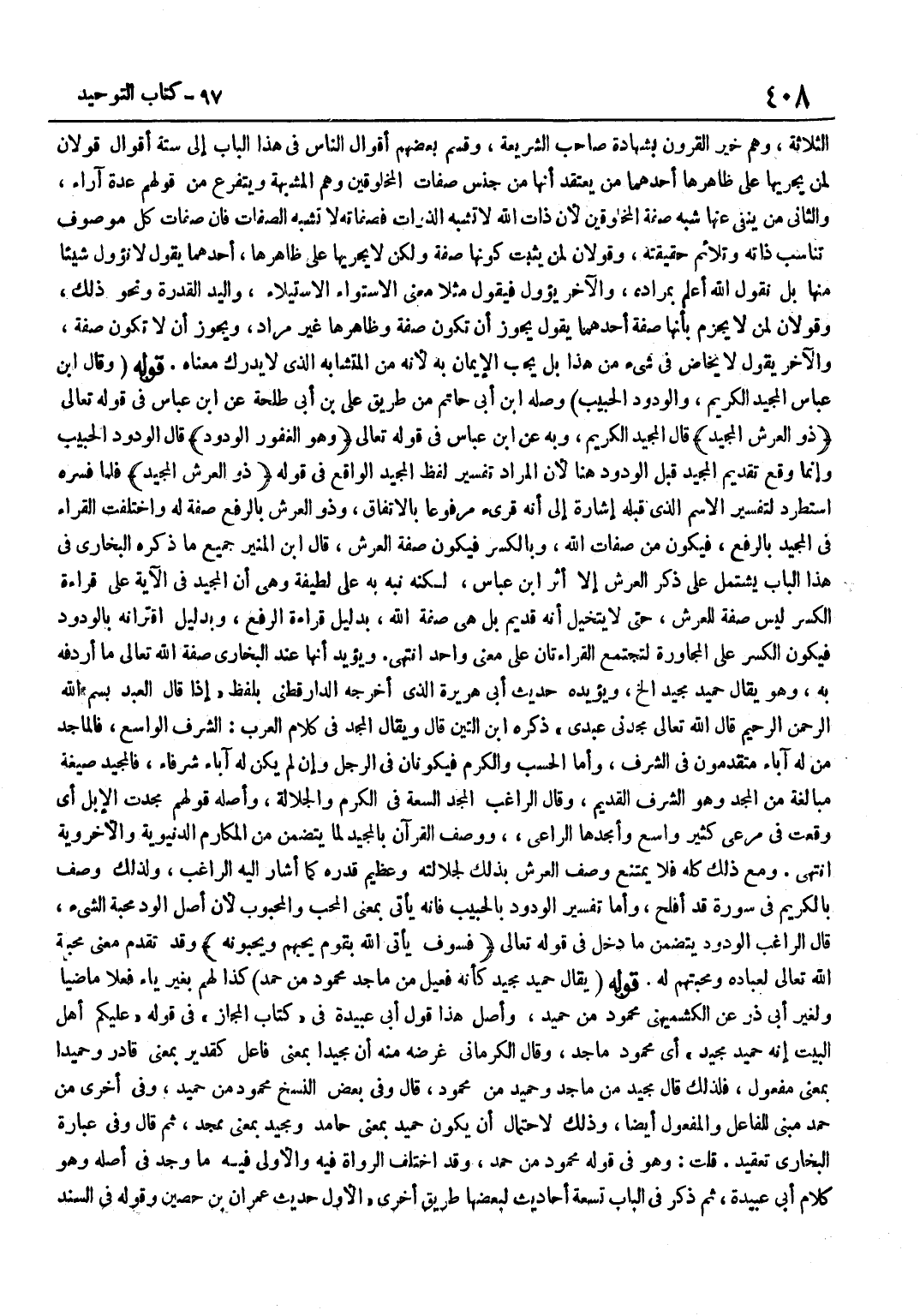 الثَّلَاثَةِ وَهُمْ خَيْرُ الْقُرُونِ بِشَهَادَةِ صَاحِبِ الشَّرِيعَةِ وَقَسَّمَ بَعْضُهُمْ أَقْوَالَ النَّاسِ فِي هَذَا الْبَابِ إِلَى سِتَّةِ أَقْوَالٍ قَوْلَانِ لِمَنْ يُجْرِيهَا عَلَى ظَاهِرِهَا أَحَدُهُمَا مَنْ يَعْتَقِدُ أَنَّهَا مِنْ جِنْسِ صِفَاتِ الْمَخْلُوقِينَ وَهُمُ الْمُشَبِّهَةُ وَيَتَفَرَّعُ مِنْ قَوْلِهِمْ عِدَّةُ آرَاءٍ وَالثَّانِي مَنْ يَنْفِي عَنْهَا شَبَهَ صِفَةِ الْمَخْلُوقِينَ لِأَنَّ ذَاتَ اللَّهِ لَا تُشْبِهُ الذَّوَاتَ فَصِفَاتُهُ لَا تُشْبِهُ الصِّفَاتِ فَإِنَّ صِفَاتِ كُلِّ مَوْصُوفٍ تُنَاسِبُ ذَاتَهُ وَتُلَائِمُ حَقِيقَتَهُ وَقَوْلَانِ لِمَنْ يُثْبِتُ كَوْنَهَا صِفَةً وَلَكِنْ لَا يُجْرِيهَا عَلَى ظَاهِرِهَا أَحَدُهُمَا يَقُولُ لَا نُؤَوِّلُ شَيْئًا مِنْهَا بَلْ نَقُولُ اللَّهُ أَعْلَمُ بِمُرَادِهِ وَالْآخَرُ يُؤَوِّلُ فَيَقُولُ مَثَلًا مَعْنَى الِاسْتِوَاءِ الِاسْتِيلَاءُ وَالْيَدُ الْقُدْرَةُ وَنَحْوُ ذَلِكَ وَقَوْلَانِ لِمَنْ لَا يَجْزِمُ بِأَنَّهَا صِفَةٌ أَحَدُهُمَا يَقُولُ يَجُوزُ أَنْ تَكُونَ صِفَةً وَظَاهِرُهَا غَيْرُ مُرَادٍ وَيَجُوزُ أَنْ لَا تَكُونَ صِفَةً وَالْآخَرُ يَقُولُ لَا يُخَاضُ فِي شَيْءٍ مِنْ هَذَا بَلْ يَجِبُ الْإِيمَانُ بِهِ لِأَنَّهُ مِنَ الْمُتَشَابِهِ الَّذِي لَا يُدْرَكُ مَعْنَاهُ قَوْله وَقَالَ بن عَبَّاس الْمجِيد الْكَرِيم والودود الحبيب وَصله بن أَبِي حَاتِمٍ مِنْ طَرِيقِ عَلِيِّ بْنِ أَبِي طَلْحَةَ عَنِ بْنِ عَبَّاسٍ فِي قَوْلِهِ تَعَالَى ذُو الْعَرْشِ الْمَجِيدُ قَالَ الْمجِيد الْكَرِيم وَبِه عَن بن عَبَّاسٍ فِي قَوْلِهِ تَعَالَى وَهُوَ الْغَفُورُ الْوَدُودُ قَالَ الْوَدُودُ الْحَبِيبُ وَإِنَّمَا وَقَعَ تَقْدِيمُ الْمَجِيدِ قَبْلَ الْوَدُودِ هُنَا لِأَنَّ الْمُرَادَ تَفْسِيرُ لَفْظِ الْمَجِيدِ الْوَاقِعِ فِي قَوْلِهِ ذُو الْعَرْشِ الْمَجِيدُ فَلَمَّا فَسَّرَهُ اسْتَطْرَدَ لِتَفْسِيرِ الِاسْمِ الَّذِي قَبْلَهُ إِشَارَةً إِلَى أَنَّهُ قُرِئَ مَرْفُوعًا بِالِاتِّفَاقِ وَذُو الْعَرْشِ بِالرَّفْعِ صِفَةٌ لَهُ وَاخْتَلَفَتِ الْقُرَّاءُ فِي الْمَجِيدُ بِالرَّفْعِ فَيَكُونُ مِنْ صِفَاتِ اللَّهِ وَبِالْكَسْرِ فَيكون صفة الْعَرْش قَالَ بن الْمُنِيرِ جَمِيعُ مَا ذَكَرَهُ الْبُخَارِيُّ فِي هَذَا الْبَابِ يَشْتَمِلُ عَلَى ذِكْرِ الْعَرْشِ إِلَّا أَثَرَ بن عَبَّاسٍ لَكِنَّهُ نَبَّهَ بِهِ عَلَى لَطِيفَةٍ وَهِيَ أَنَّ الْمَجِيدَ فِي الْآيَةِ عَلَى قِرَاءَةِ الْكَسْرِ لَيْسَ صِفَةً لِلْعَرْشِ حَتَّى لَا يُتَخَيَّلَ أَنَّهُ قَدِيمٌ بَلْ هِيَ صِفَةُ اللَّهِ بِدَلِيلِ قِرَاءَةِ الرَّفْعِ وَبِدَلِيلِ اقْتِرَانِهِ بِالْوَدُودِ فَيَكُونُ الْكَسْرُ عَلَى الْمُجَاوَرَةِ لِتَجْتَمِعَ الْقِرَاءَتَانِ عَلَى مَعْنًى وَاحِدٍ انْتَهَى وَيُؤَيِّدُ أَنَّهَا عِنْدَ الْبُخَارِيِّ صِفَةُ اللَّهِ تَعَالَى مَا أَرْدَفَهُ بِهِ وَهُوَ يُقَالُ حَمِيدٌ مَجِيدٌ إِلَخْ وَيُؤَيِّدُهُ حَدِيثُ أَبِي هُرَيْرَةَ الَّذِي أَخْرَجَهُ الدَّارَقُطْنِيُّ بِلَفْظِ إِذَا قَالَ الْعَبْدُ بِسْمِ اللَّهِ الرَّحْمَنِ الرَّحِيمِ قَالَ اللَّهُ تَعَالَى مَجَّدَنِي عَبْدِي ذكره بن التِّينِ قَالَ وَيُقَالُ الْمَجْدُ فِي كَلَامِ الْعَرَبِ الشَّرَفُ الْوَاسِعُ فَالْمَاجِدُ مَنْ لَهُ آبَاءٌ مُتَقَدِّمُونَ فِي الشَّرَفِ وَأَمَّا الْحَسَبُ وَالْكَرَمُ فَيَكُونَانِ فِي الرَّجُلِ وَإِنْ لَمْ يَكُنْ لَهُ آبَاءٌ شُرَفَاءُ فَالْمَجِيدُ صِيغَةُ مُبَالَغَةٍ مِنَ الْمَجْدِ وَهُوَ الشَّرَفُ الْقَدِيمُ وَقَالَ الرَّاغِبُ الْمَجْدُ السَّعَةُ فِي الْكَرَمِ وَالْجَلَالَةِ وَأَصْلُهُ قَوْلُهُمْ مَجَدَتِ الْإِبِلُ أَيْ وَقَعَتْ فِي مَرْعًى كَثِيرٍ وَاسِع