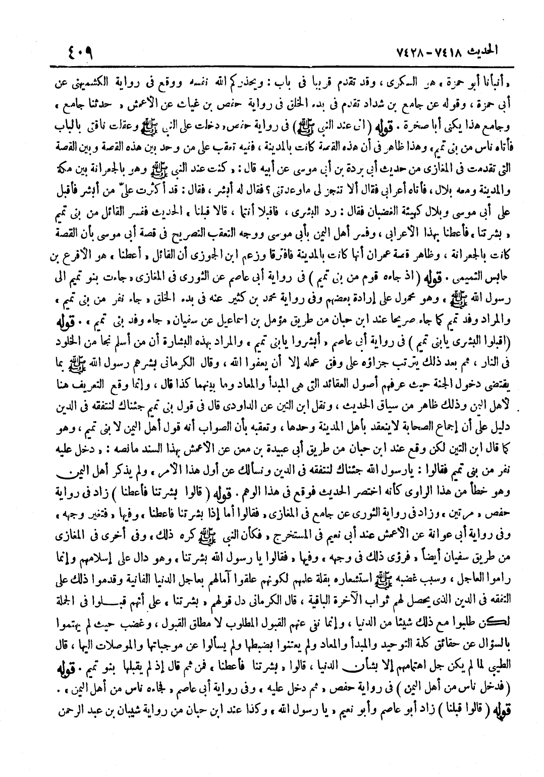 [7418] عَنْ جَامِعِ بْنِ شَدَّادٍ تَقَدَّمَ فِي بَدْءِ الْخَلْقِ فِي رِوَايَةِ حَفْصِ بْنِ غِيَاثٍ عَنِ الْأَعْمَشِ حَدَّثَنَا جَامِعٌ وَجَامِعٌ هَذَا يُكْنَى أَبَا صَخْرَةَ قَوْلُهُ إِنِّي عِنْدَ النَّبِيِّ صَلَّى اللَّهُ عَلَيْهِ وَسَلَّمَ فِي رِوَايَةِ حَفْصٍ دَخَلَتْ عَلَى النَّبِيِّ صَلَّى اللَّهُ عَلَيْهِ وَسَلَّمَ وَعَقَلْتُ نَاقَتِي بِالْبَابِ فَأَتَاهُ نَاسٌ مِنْ بَنِي تَمِيمٍ وَهَذَا ظَاهِرٌ فِي أَنَّ هَذِهِ الْقِصَّةَ كَانَتْ بِالْمَدِينَةِ فَفِيهِ تَعَقُّبٌ عَلَى مَنْ وَحَّدَ بَيْنَ هَذِهِ الْقِصَّةِ وَبَيْنَ الْقِصَّةِ الَّتِي تَقَدَّمَتْ فِي الْمَغَازِي مِنْ حَدِيثِ أَبِي بُرْدَةَ بْنِ أَبِي مُوسَى عَنْ أَبِيهِ قَالَ كُنْتُ عِنْدَ النَّبِيِّ صَلَّى اللَّهُ عَلَيْهِ وَسَلَّمَ وَهُوَ بِالْجِعْرَانَةِ بَيْنَ مَكَّةَ وَالْمَدِينَةِ وَمَعَهُ بِلَالٌ فَأَتَاهُ أَعْرَابِيٌّ فَقَالَ أَلَا تُنْجِزُ لِي مَا وَعَدْتَنِي فَقَالَ لَهُ أَبْشِرْ فَقَالَ قَدْ أَكْثَرْتَ عَلَيَّ مِنْ أَبْشِرْ فَأَقْبَلَ عَلَى أَبِي مُوسَى وَبِلَالٌ كَهَيْئَةِ الْغَضْبَانِ فَقَالَ رَدَّ الْبُشْرَى فَاقْبَلَا أَنْتُمَا قَالَا قَبِلْنَا الْحَدِيثَ فَفَسَّرَ الْقَائِل من بَنِي تَمِيمٍ بَشَّرْتَنَا فَأَعْطِنَا بِهَذَا الْأَعْرَابِيِّ وَفَسَّرَ أَهْلَ الْيَمَنِ بِأَبِي مُوسَى وَوَجْهُ التَّعَقُّبِ التَّصْرِيحُ فِي قِصَّةِ أَبِي مُوسَى بِأَنَّ الْقِصَّةَ كَانَتْ بِالْجِعْرَانَةِ وَظَاهِرَ قِصَّةِ عِمْرَانَ أَنَّهَا كَانَتْ بِالْمَدِينَةِ فَافْتَرقَا وَزعم بن الْجَوْزِيّ ان الْقَائِل أعطنا هُوَ الأفرع بْنُ حَابِسٍ التَّمِيمِيُّ قَوْلُهُ إِذْ جَاءَهُ قَوْمٌ مِنْ بَنِي تَمِيمٍ فِي رِوَايَةِ أَبِي عَاصِمٍ عَنِ الثَّوْرِيِّ فِي الْمَغَازِي جَاءَتْ بَنُو تَمِيمٍ إِلَى رَسُولِ اللَّهِ صَلَّى اللَّهُ عَلَيْهِ وَسَلَّمَ وَهُوَ مَحْمُولٌ عَلَى إِرَادَةِ بَعْضِهِمْ وَفِي رِوَايَةِ مُحَمَّدِ بْنِ كَثِيرٍ عَنْهُ فِي بَدْءِ الْخَلْقِ جَاءَ نَفَرٌ مِنْ بَنِي تَمِيمٍ وَالْمُرَادُ وَفْدُ تَمِيم كَمَا جَاءَ صَرِيحًا عِنْد بن حِبَّانَ مِنْ طَرِيقِ مُؤَمِّلِ بْنِ إِسْمَاعِيلَ عَنْ سُفْيَانَ جَاءَ وَفْدٌ بَنِي تَمِيمٍ قَوْلُهُ اقْبَلُوا الْبُشْرَى يَا بَنِي تَمِيمٍ فِي رِوَايَةِ أَبِي عَاصِمٍ أَبْشِرُوا يَا بَنِي تَمِيمٍ وَالْمُرَادُ بِهَذِهِ الْبِشَارَةِ أَنَّ مَنْ أَسْلَمَ نَجَا مِنَ الْخُلُودِ فِي النَّارِ ثُمَّ بَعْدَ ذَلِكَ يَتَرَتَّبُ جَزَاؤُهُ على وفْق عملة الا ان يعفوا اللَّهُ وَقَالَ الْكِرْمَانِيُّ بَشَّرَهُمْ رَسُولَ اللَّهِ صَلَّى اللَّهُ عَلَيْهِ وَسَلَّمَ بِمَا يَقْتَضِي دُخُولَ الْجَنَّةِ حَيْثُ عَرَّفَهُمْ أُصُولَ الْعَقَائِدِ الَّتِي هِيَ الْمَبْدَأُ وَالْمَعَادُ وَمَا بَيْنَهُمَا كَذَا قَالَ وَإِنَّمَا وَقَعَ التَّعْرِيفُ هُنَا لِأَهْلِ الْيَمَنِ وَذَلِكَ ظَاهِرٌ مِنْ سِيَاق الحَدِيث وَنقل بن التِّينِ عَنِ الدَّاوُدِيِّ قَالَ فِي قَوْلِ بَنِي تَمِيمٍ جِئْنَاكَ لِنَتَفَقَّهَ فِي الدِّينِ دَلِيلٌ عَلَى أَنَّ إِجْمَاعَ الصَّحَابَةِ لَا يَنْعَقِدُ بِأَهْلِ الْمَدِينَةِ وَحْدَهَا وَتَعَقَّبَهُ بِأَنَّ الصَّوَابَ أَنَّهُ قَوْلُ أَهْلِ الْيَمَنِ لَا بَنِي تَمِيمٍ وَهُوَ كَمَا قَالَ بن التِّين لَكِن وَقع عِنْد بن حِبَّانَ مِنْ طَرِيقِ أَبِي عُبَيْدَةَ بْنِ مَعْنٍ عَنِ الْأَعْمَشِ بِهَذَا السَّنَدِ مَا نَصُّهُ دَخَلَ عَلَيْهِ نَفَرٌ مِنْ بَنِي تَمِيمٍ فَقَالُوا يَا رَسُولَ اللَّهِ جِئْنَاكَ لِنَتَفَقَّهَ فِي الدِّينِ وَنَسْأَلَكَ عَنْ أَوَّلِ هَذَا الْأَمْرِ وَلَمْ يَذْكُرْ أَهْلَ الْيَمَنِ وَهُوَ خَطَأٌ مِنْ هَذَا الرَّاوِي كَأَنَّهُ اخْتَصَرَ الْحَدِيثَ فَوَقَعَ فِي هَذَا الْوَهْ