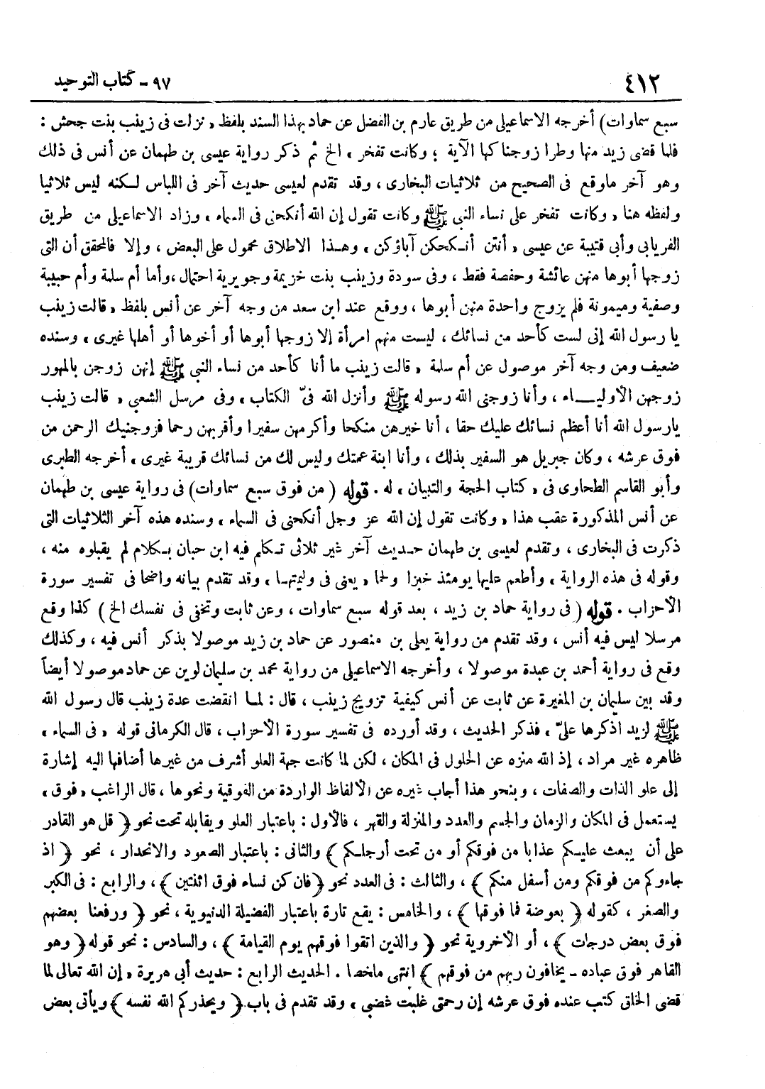 سَبْعِ سَمَاوَاتٍ أَخْرَجَهُ الْإِسْمَاعِيلِيُّ مِنْ طَرِيقِ عَارِمِ بْنِ الْفَضْلِ عَنْ حَمَّادٍ بِهَذَا السَّنَدِ بِلَفْظِ نَزَلَتْ فِي زَيْنَبَ بِنْتِ جَحْشٍ فَلَمَّا قَضَى زيد مِنْهَا وطرا زَوَّجْنَاكهَا الْآيَةَ وَكَانَتْ تَفْخَرُ إِلَخْ ثُمَّ ذَكَرَ رِوَايَةَ عِيسَى بْنِ طَهْمَانَ عَنْ أَنَسٍ فِي ذَلِكَ وَهُوَ آخِرُ مَا وَقَعَ فِي الصَّحِيحِ مِنْ ثُلَاثِيَّاتِ الْبُخَارِيِّ وَقَدْ تَقَدَّمَ لِعِيسَى حَدِيثٌ آخَرُ فِي اللِّبَاسِ لَكِنَّهُ لَيْسَ ثُلَاثِيًّا وَلَفْظُهُ هُنَا وَكَانَتْ تَفْخَرُ عَلَى نِسَاءِ النَّبِيِّ صَلَّى اللَّهُ عَلَيْهِ وَسَلَّمَ وَكَانَتْ تَقُولُ إِنَّ اللَّهَ أَنْكَحَنِي فِي السَّمَاءِ وَزَادَ الْإِسْمَاعِيلِيُّ مِنْ طَرِيقِ الْفِرْيَابِيِّ وَأَبِي قُتَيْبَةَ عَنْ عِيسَى أَنْتُنَّ أَنْكَحَكُنَّ آبَاؤُكُنَّ وَهَذَا الْإِطْلَاقُ مَحْمُولٌ عَلَى الْبَعْضِ وَإِلَّا فَالْمُحَقَّقُ أَنَّ الَّتِي زَوَّجَهَا أَبُوهَا مِنْهُنَّ عَائِشَةُ وَحَفْصَةُ فَقَطْ وَفِي سَوْدَةَ وَزَيْنَبَ بِنْتِ خُزَيْمَةَ وَجُوَيْرِيَةَ احْتِمَالٌ وَأَمَّا أُمُّ سَلَمَةَ وَأُمُّ حَبِيبَةَ وَصَفِيَّةُ وَمَيْمُونَةُ فَلَمْ يُزَوِّجْ وَاحِدَةً مِنْهُنَّ أَبُوهَا وَوَقَعَ عِنْد بن سَعْدٍ مِنْ وَجْهٍ آخَرَ عَنْ أَنَسٍ بِلَفْظِ قَالَتْ زَيْنَبُ يَا رَسُولَ اللَّهِ إِنِّي لَسْتُ كَأحد من نِسَائِك لَيست مِنْهُم امْرَأَةٌ إِلَّا زَوَّجَهَا أَبُوهَا أَوْ أَخُوهَا أَوْ أَهلهَا غَيْرِي وَسَنَده ضَعِيف وَمن وَجْهٍ آخَرَ مَوْصُولٍ عَنْ أُمِّ سَلَمَةَ قَالَتْ زَيْنَبُ مَا أَنَا كَأَحَدٍ مِنْ نِسَاءِ النَّبِيِّ صَلَّى اللَّهُ عَلَيْهِ وَسَلَّمَ إِنَّهُنَّ زُوِّجْنَ بِالْمُهُورِ زوجهن الْأَوْلِيَاء وانا زَوجنِي الله رَسُوله صَلَّى اللَّهُ عَلَيْهِ وَسَلَّمَ وَأَنْزَلَ اللَّهُ فِي الْكِتَابِ وَفِي مُرْسَلِ الشَّعْبِيِّ قَالَتْ زَيْنَبُ يَا رَسُولَ اللَّهِ أَنَا أَعْظَمُ نِسَائِكَ عَلَيْكَ حَقًّا أَنَا خَيْرُهُنَّ مَنْكِحًا وَأَكْرَمُهُنَّ سَفِيرًا وَأَقْرَبُهُنَّ رَحِمًا فَزَوَّجَنِيكَ الرَّحْمَنُ مِنْ فَوْقِ عَرْشِهِ وَكَانَ جِبْرِيلُ هُوَ السَّفِيرُ بِذَلِكَ وَأَنَا ابْنَةُ عَمَّتِكَ وَلَيْسَ لَكَ مِنْ نِسَائِكَ قَرِيبَةٌ غَيْرِي أَخْرَجَهُ الطَّبَرِيُّ وَأَبُو الْقَاسِمِ الطَّحَاوِيُّ فِي كِتَابِ الْحُجَّةِ وَالتِّبْيَانِ لَهُ قَوْلُهُ مِنْ فَوْقِ سَبْعِ سَمَاوَاتٍ فِي رِوَايَةِ عِيسَى بْنِ طَهْمَانَ عَنْ أَنَسٍ الْمَذْكُورَةِ عَقِبَ هَذَا وَكَانَتْ تَقُولُ إِنَّ اللَّهَ عَزَّ وَجَلَّ أَنْكَحَنِي فِي السَّمَاءِ وَسَنَدُهُ هَذِهِ آخِرُ الثُّلَاثِيَّاتِ الَّتِي ذُكِرَتْ فِي الْبُخَارِيِّ وَتَقَدَّمَ لِعِيسَى بْنِ طَهْمَانَ حَدِيثٌ آخَرُ غَيْرُ ثُلَاثِيٍّ تَكَلَّمَ فِيهِ بن حِبَّانَ بِكَلَامٍ لَمْ يَقْبَلُوهُ مِنْهُ وَقَوْلُهُ فِي هَذِهِ الرِّوَايَةِ وَأَطْعَمَ عَلَيْهَا يَوْمَئِذٍ خُبْزًا وَلَحْمًا يَعْنِي فِي وَلِيمَتِهَا وَقَدْ تَقَدَّمَ بَيَانُهُ وَاضِحًا فِي تَفْسِيرِ سُورَةِ الْأَحْزَابِ قَوْلُهُ فِي رِوَايَةِ حَمَّادِ بْنِ زَيْدٍ بَعْدَ قَوْلِهِ سَبْعِ سَمَاوَاتٍ وَعَنْ ثَابِتٍ وَتُخْفِي فِي نَفْسِكَ إِلَخْ كَذَا وَقَعَ مُرْسَلًا لَيْسَ فِيهِ أَنَسٌ وَقَدْ تَقَدَّمَ مِنْ رِوَايَةِ يَعْلَى بْنِ مَنْصُورٍ عَنْ حَمَّادِ بْنِ زَيْدٍ مَوْصُولًا بِذِكْرِ أَنَسٍ فِيهِ وَكَذَلِكَ وَقَعَ فِي رِوَايَةِ أَحْمَدَ بْنِ عَبْدَةَ مَوْصُولًا وَأَخْرَجَهُ الْإِسْمَاعِيلِيُّ مِنْ رِوَايَةِ مُحَمَّدِ بْنِ سُلَيْمَانَ لُوَيْنٌ عَنْ حَمَّادٍ مَوْصُولًا أَيْضًا وَقَدْ بَيَّنَ سُلَيْمَانَ بْنِ الْمُغِيرَةِ عَنْ ثَابِتٍ عَنْ أَنَسٍ كَيْفِيَّةَ تَزْوِيجِ زَيْنَبَ قَالَ لَ