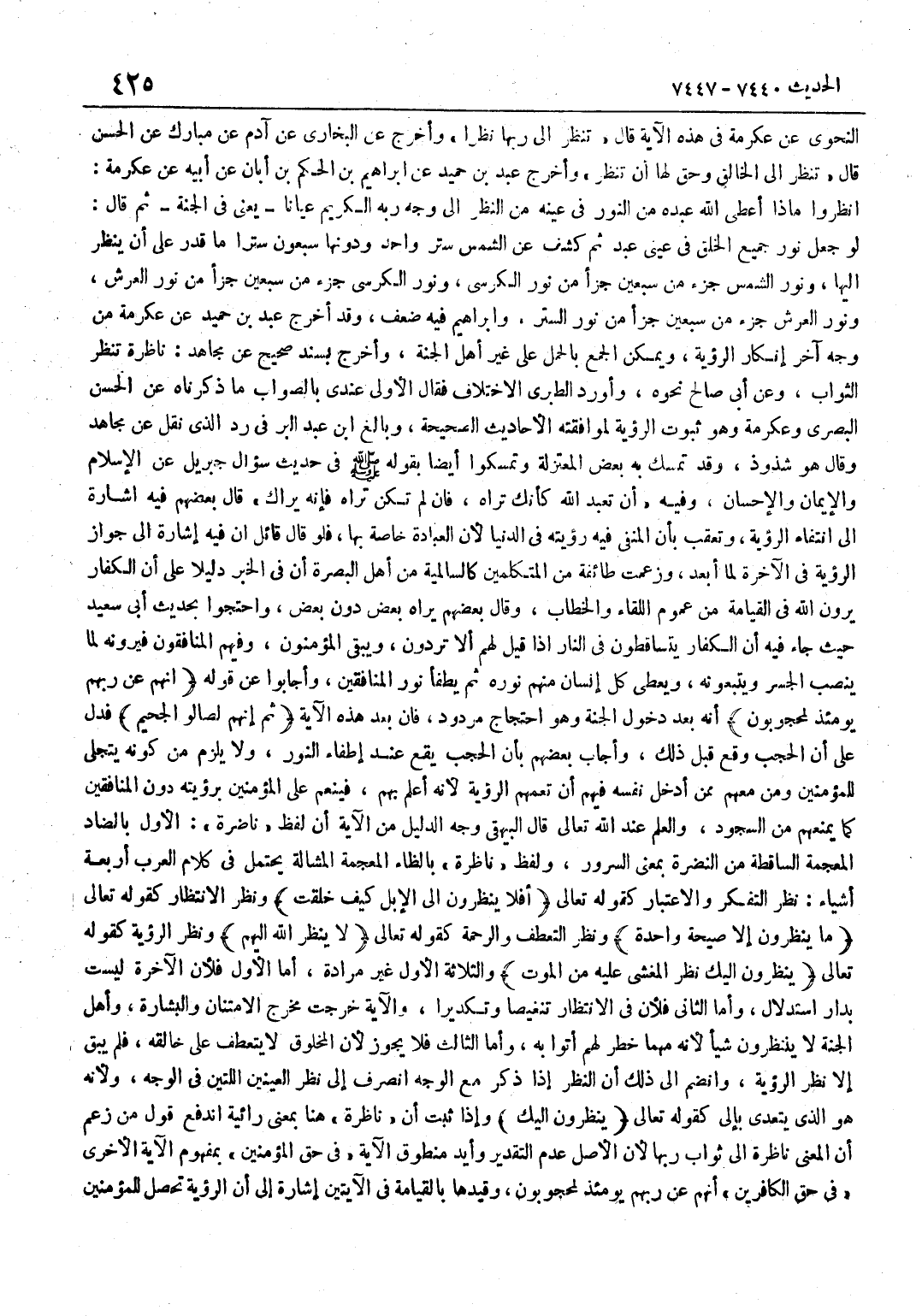 النَّحْوِيِّ عَنْ عِكْرِمَةَ فِي هَذِهِ الْآيَةِ قَالَ تَنْظُرُ إِلَى رَبِّهَا نَظَرًا وَأَخْرَجَ عَنِ الْبُخَارِيِّ عَنْ آدَمَ عَنْ مُبَارَكٍ عَنِ الْحَسَنِ قَالَ تَنْظُرُ إِلَى الْخَالِقِ وَحُقَّ لَهَا أَنْ تَنْظُرَ وَأَخْرَجَ عَبْدُ بْنُ حُمَيْدٍ عَنْ إِبْرَاهِيمَ بْنِ الْحَكَمِ بْنِ أَبَانَ عَنْ أَبِيهِ عَنْ عِكْرِمَةَ انْظُرُوا مَاذَا أَعْطَى اللَّهُ عَبْدَهُ مِنَ النُّورِ فِي عَيْنِهِ مِنَ النَّظَرِ إِلَى وَجْهِ رَبِّهِ الْكَرِيمِ عِيَانًا يَعْنِي فِي الْجَنَّةِ ثُمَّ قَالَ لَوْ جُعِلَ نُورُ جَمِيعِ الْخَلْقِ فِي عَيْنَيْ عَبْدٍ ثُمَّ كُشِفَ عَنِ الشَّمْسِ سِتْرٌ وَاحِدٌ وَدُونُهَا سَبْعُونَ سِتْرًا مَا قَدَرَ عَلَى أَنْ يَنْظُرَ إِلَيْهَا وَنُورُ الشَّمْسِ جُزْءٌ مِنْ سَبْعِينَ جزأ مِنْ نُورِ الْكُرْسِيِّ وَنُورُ الْكُرْسِيِّ جُزْءٌ مِنْ سبعين جزأ مِنْ نُورِ الْعَرْشِ وَنُورُ الْعَرْشِ جُزْءٌ مِنْ سبعين جزأ مِنْ نُورِ السِّتْرِ وَإِبْرَاهِيمُ فِيهِ ضَعْفٌ وَقَدْ أَخْرَجَ عَبْدُ بْنُ حُمَيْدٍ عَنْ عِكْرِمَةَ مِنْ وَجْهٍ آخَرَ إِنْكَارَ الرُّؤْيَةِ وَيُمْكِنُ الْجَمْعُ بِالْحَمْلِ عَلَى غَيْرِ أَهْلِ الْجَنَّةِ وَأَخْرَجَ بِسَنَدٍ صَحِيحٍ عَنْ مُجَاهِدٍ نَاظِرَةٌ تَنْظُرُ الثَّوَابَ وَعَنْ أَبِي صَالِحٍ نَحْوَهُ وَأَوْرَدَ الطَّبَرِيُّ الِاخْتِلَافَ فَقَالَ الْأَوْلَى عِنْدِي بِالصَّوَابِ مَا ذَكَرْنَاهُ عَنِ الْحَسَنِ الْبَصْرِيِّ وَعِكْرِمَةَ وَهُوَ ثُبُوتُ الرُّؤْيَةِ لِمُوَافَقَتِهِ الْأَحَادِيثَ الصَّحِيحَةَ وَبَالغ بن عَبْدِ الْبَرِّ فِي رَدِّ الَّذِي نُقِلَ عَنْ مُجَاهِدٍ وَقَالَ هُوَ شُذُوذٌ وَقَدْ تَمَسَّكَ بِهِ بَعْضُ الْمُعْتَزِلَةِ وَتَمَسَّكُوا أَيْضًا بِقَوْلِهِ صَلَّى اللَّهُ عَلَيْهِ وَسَلَّمَ فِي حَدِيثِ سُؤَالِ جِبْرِيلَ عَنِ الْإِسْلَامِ وَالْإِيمَانِ وَالْإِحْسَانِ وَفِيهِ أَنْ تَعْبُدَ اللَّهَ كَأَنَّكَ تَرَاهُ فَإِنْ لَمْ تَكُنْ تَرَاهُ فَإِنَّهُ يَرَاكَ قَالَ بَعْضُهُمْ فِيهِ إِشَارَةٌ إِلَى انْتِفَاءِ الرُّؤْيَةِ وَتُعُقِّبَ بِأَنَّ الْمَنْفِيَّ فِيهِ رُؤْيَتُهُ فِي الدُّنْيَا لِأَنَّ الْعِبَادَةَ خَاصَّةٌ بِهَا فَلَوْ قَالَ قَائِلٌ إِنَّ فِيهِ إِشَارَةً إِلَى جَوَازِ الرُّؤْيَةِ فِي الْآخِرَةِ لَمَا أَبْعَدَ وَزَعَمَتْ طَائِفَةٌ مِنَ الْمُتَكَلِّمِينَ كَالسَّالِمِيَّةِ مِنْ أَهْلِ الْبَصْرَةِ أَنَّ فِي الْخَبَرِ دَلِيلًا عَلَى أَنَّ الْكُفَّارَ يَرَوْنَ اللَّهَ فِي الْقِيَامَةِ مِنْ عُمُومِ اللِّقَاءِ وَالْخِطَابِ وَقَالَ بَعْضُهُمْ يَرَاهُ بَعْضٌ دُونَ بَعْضٍ وَاحْتَجُّوا بِحَدِيثِ أَبِي سَعِيدٍ حَيْثُ جَاءَ فِيهِ أَنَّ الْكُفَّارَ يَتَسَاقَطُونَ فِي النَّارِ إِذَا قِيلَ لَهُمْ أَلَا تَرُدُّونَ وَيَبْقَى الْمُؤْمِنُونَ وَفِيهِمُ الْمُنَافِقُونَ فَيَرَوْنَهُ لَمَّا يَنْصِبُ الْجِسْرَ وَيَتْبَعُونَهُ وَيُعْطِي كُلَّ إِنْسَانٍ مِنْهُمْ نُورَهُ ثُمَّ يُطْفَأُ نُورُ الْمُنَافِقِينَ وَأَجَابُوا عَنْ قَوْله انهم عَن رَبهم يَوْمئِذٍ لمحجوبون أَنَّهُ بَعْدَ دُخُولِ الْجَنَّةِ وَهُوَ احْتِجَاجٌ مَرْدُودٌ فَإِنَّ بَعْدَ هَذِهِ الْآيَةِ ثُمَّ إِنَّهُمْ لَصَالُو الْجَحِيم فَدَلَّ عَلَى أَنَّ الْحَجْبِ وَقَعَ قَبْلَ ذَلِكَ وَأَجَابَ بَعْضُهُمْ بِأَنَّ الْحَجْبَ يَقَعُ عِنْدَ إِطْفَاءِ النُّورِ وَلَا يَلْزَمُ مِنْ كَوْنِهِ يَتَجَلَّى لِلْمُؤْمِنِينَ وَمَنْ مَعَهُمْ مِمَّنْ أَدْخَلَ نَفْسَهُ فِيهِمْ أَنْ تَعُمَّهُمُ الرُّؤْيَةُ لِأَنَّهُ أَعْلَمُ بِهِمْ فَيُنْعِمُ عَلَى الْمُؤْمِنِينَ بِرُؤْيَتِهِ دُونَ الْمُنَافِقِينَ كَمَا يَمْنَعُهُمْ مِنَ السُّجُودِ وَالْعِلْمُ عِنْدَ اللَّهِ تَعَالَى قَالَ الْبَيْهَقِيُّ وَجْهُ 