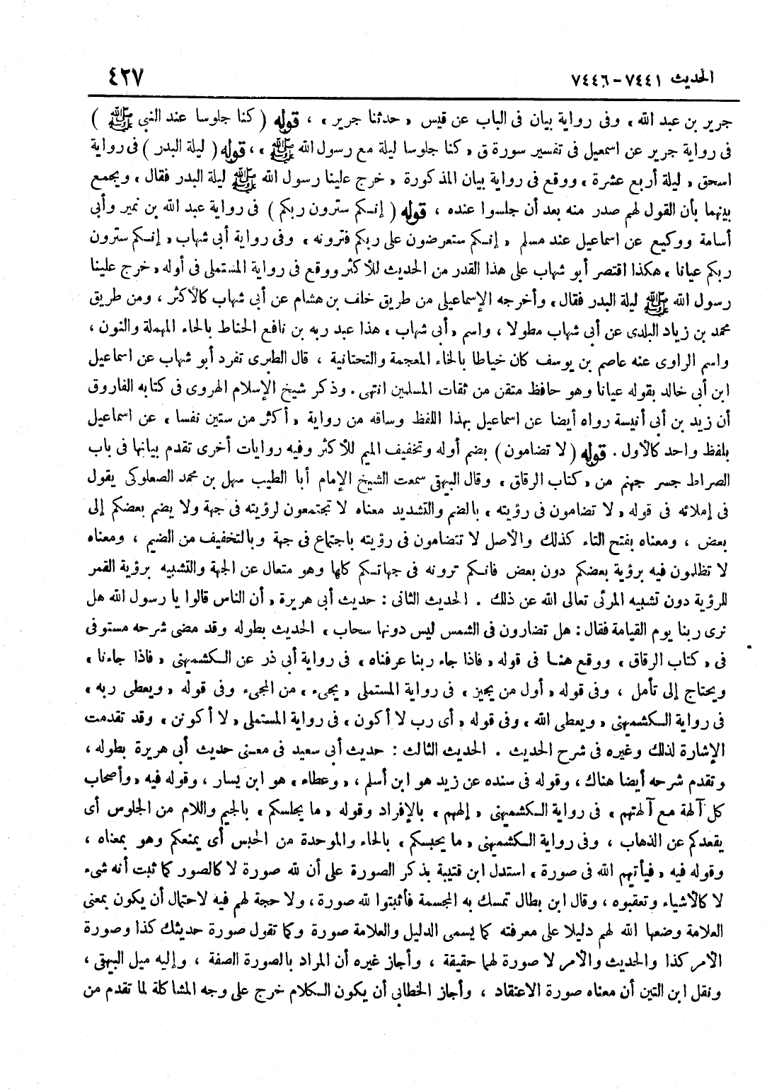 جَرِيرَ بْنَ عَبْدِ اللَّهِ وَفِي رِوَايَةِ بَيَانٍ فِي الْبَابِ عَنْ قَيْسٍ حَدَّثَنَا جَرِيرٌ قَوْلُهُ كُنَّا جُلُوسًا عِنْدَ النَّبِيِّ صَلَّى اللَّهُ عَلَيْهِ وَسَلَّمَ فِي رِوَايَةِ جَرِيرٍ عَنْ إِسْمَاعِيلَ فِي تَفْسِيرِ سُورَةِ ق كُنَّا جُلُوسًا لَيْلَةً مَعَ رَسُولِ اللَّهِ صَلَّى اللَّهُ عَلَيْهِ وَسَلَّمَ قَوْلُهُ لَيْلَةَ الْبَدْرِ فِي رِوَايَةِ إِسْحَاقَ لَيْلَةَ أَرْبَعَ عَشْرَةَ وَوَقَعَ فِي رِوَايَةِ بَيَانٍ الْمَذْكُورَةِ خَرَجَ عَلَيْنَا رَسُولُ اللَّهِ صَلَّى اللَّهُ عَلَيْهِ وَسَلَّمَ لَيْلَةً الْبَدْرِ فَقَالَ وَيُجْمَعُ بَيْنَهُمَا بِأَنَّ الْقَوْلَ لَهُمْ صَدَرَ مِنْهُ بَعْدَ أَنْ جَلَسُوا عِنْدَهُ قَوْلُهُ إِنَّكُمْ سَتَرَوْنَ رَبَّكُمْ فِي رِوَايَةِ عَبْدِ اللَّهِ بْنِ نُمَيْرٍ وَأَبِي أُسَامَةَ وَوَكِيعٍ عَنْ إِسْمَاعِيلَ عِنْدَ مُسْلِمٍ إِنَّكُمْ سَتُعْرَضُونَ عَلَى رَبِّكُمْ فَتَرَوْنَهُ وَفِي رِوَايَةِ أَبِي شِهَابٍ إِنَّكُمْ سَتَرَوْنَ رَبَّكُمْ عِيَانًا هَكَذَا اقْتَصَرَ أَبُو شِهَابٍ عَلَى هَذَا الْقَدْرِ مِنَ الْحَدِيثِ لِلْأَكْثَرِ وَوَقَعَ فِي رِوَايَةِ الْمُسْتَمْلِي فِي أَوَّلِهِ خَرَجَ عَلَيْنَا رَسُولُ اللَّهِ صَلَّى اللَّهُ عَلَيْهِ وَسَلَّمَ لَيْلَةً الْبَدْرِ فَقَالَ وَأَخْرَجَهُ الْإِسْمَاعِيلِيُّ مِنْ طَرِيقِ خَلَفِ بْنِ هِشَامٍ عَنْ أَبِي شِهَابٍ كَالْأَكْثَرِ وَمِنْ طَرِيقِ مُحَمَّدِ بْنِ زِيَادٍ الْبَلَدِيِّ عَنْ أَبِي شِهَابٍ مُطَوَّلًا وَاسْمُ أَبِي شِهَابٍ هَذَا عَبْدُ رَبِّهِ بْنُ نَافِعٍ الْحَنَّاطُ بِالْحَاءِ الْمُهْمَلَةِ وَالنُّونِ وَاسْمُ الرَّاوِي عَنْهُ عَاصِمُ بْنُ يُوسُفَ كَانَ خَيَّاطًا بِالْخَاءِ الْمُعْجَمَةِ وَالتَّحْتَانِيَّةِ قَالَ الطَّبَرِيُّ تَفَرَّدَ أَبُو شِهَابٍ عَنْ إِسْمَاعِيلَ بْنِ أَبِي خَالِدٍ بِقَوْلِهِ عِيَانًا وَهُوَ حَافِظٌ مُتْقِنٌ مِنْ ثِقَاتِ الْمُسْلِمِينَ انْتَهَى وَذَكَرَ شَيْخُ الْإِسْلَامِ الْهَرَوِيُّ فِي كِتَابِهِ الْفَارُوقِ أَنَّ زَيْدَ بْنَ أَبِي أُنَيْسَةَ رَوَاهُ أَيْضًا عَنْ إِسْمَاعِيلَ بِهَذَا اللَّفْظِ وَسَاقَهُ مِنْ رِوَايَةِ أَكْثَرَ مِنْ سِتِّينَ نَفْسًا عَنْ إِسْمَاعِيلَ بِلَفْظٍ وَاحِدٍ كَالْأَوَّلِ قَوْلُهُ لَا تُضَامُونَ بِضَمِّ أَوَّلِهِ وَتَخْفِيفِ الْمِيمِ لِلْأَكْثَرِ وَفِيهِ رِوَايَاتٌ أُخْرَى تَقَدَّمَ بَيَانُهَا فِي بَابِ الصِّرَاطِ جِسْرُ جَهَنَّمَ مِنْ كِتَابِ الرِّقَاقِ وَقَالَ الْبَيْهَقِيُّ سَمِعْتُ الشَّيْخَ الْإِمَامَ أَبَا الطَّيِّبِ سَهْلَ بْنَ مُحَمَّدٍ الصُّعْلُوكِيَّ يَقُولُ فِي إِمْلَائِهِ فِي قَوْلِهِ لَا تُضَامُّونَ فِي رُؤْيَتِهِ بِالضَّمِّ وَالتَّشْدِيدِ مَعْنَاهُ لَا تَجْتَمِعُونَ لِرُؤْيَتِهِ فِي جِهَةٍ وَلَا يُضَمُّ بَعْضُكُمْ إِلَى بَعْضٍ وَمَعْنَاهُ بِفَتْحِ التَّاءِ كَذَلِكَ وَالْأَصْلُ لَا تَتَضَامُّونَ فِي رُؤْيَتِهِ بِاجْتِمَاعٍ فِي جِهَةٍ وَبِالتَّخْفِيفِ مِنَ الضَّيْمِ وَمَعْنَاهُ لَا تُظْلَمُونَ فِيهِ بِرُؤْيَةِ بَعْضِكُمْ دُونَ بَعْضٍ فَإِنَّكُمْ تَرَوْنَهُ فِي جِهَاتِكُمْ كُلِّهَا وَهُوَ مُتَعَالٍ عَنِ الْجِهَةِ وَالتَّشْبِيهِ بِرُؤْيَةِ الْقَمَرِ لِلرُّؤْيَةِ دُونَ تَشْبِيهِ الْمَرْئِيِّ تَعَالَى اللَّهُ عَن ذَلِك الْحَدِيثُ الثَّانِي حَدِيثُ أَبِي هُرَيْرَةَ إِنَّ النَّاسَ قَالُوا يَا رَسُولَ اللَّهِ هَلْ نَرَى رَبَّنَا يَوْمَ الْقِيَامَةِ فَقَالَ هَلْ تُضَارُّونَ فِي الشَّمْسِ لَيْسَ دُونَهَا سَحَابٌ الْحَدِيثَ بِطُولِهِ وَقَدْ مَضَى شَرْحُهُ مُسْتَوْفًى فِي كِتَابِ الرِّقَاقِ وَوَقَعَ هُنَا فِي
