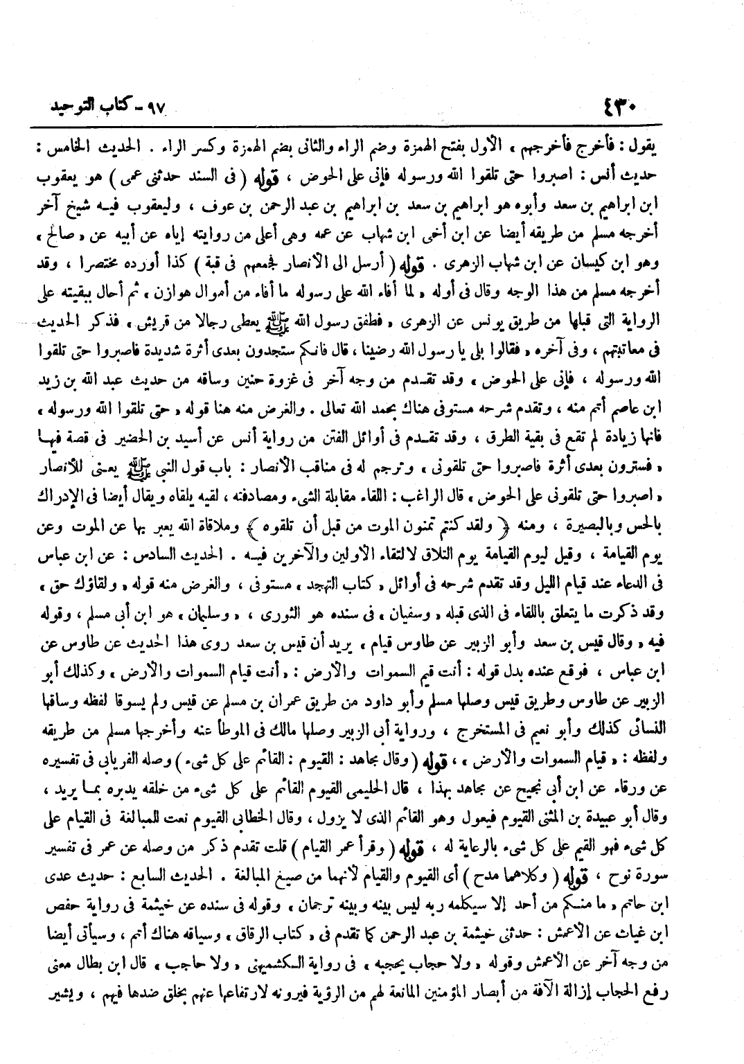 [7442] قَوْله ولقاؤك حَقٌّ وَقَدْ ذَكَرْتُ مَا يَتَعَلَّقُ بِاللِّقَاءِ فِي الَّذِي قَبْلَهُ وَسُفْيَانُ فِي سَنَدِهِ هُوَ الثَّوْرِيُّ وَسليمَان هُوَ بن أَبِي مُسْلِمٍ وَقَوْلُهُ فِيهِ وَقَالَ قَيْسُ بْنُ سَعْدٍ وَأَبُو الزُّبَيْرِ عَنْ طَاوُسٍ قِيَّامُ يُرِيدُ أَنَّ قَيْسَ بْنَ سَعْدٍ رَوَى هَذَا الْحَدِيثَ عَن طَاوس عَن بن عَبَّاسٍ فَوَقَعَ عِنْدَهُ بَدَلَ قَوْلِهِ أَنْتَ قَيِّمُ السَّمَاوَاتِ وَالْأَرْضِ أَنْتَ قَيَّامُ السَّمَاوَاتِ وَالْأَرْضِ وَكَذَلِكَ أَبُو الزُّبَيْرِ عَنْ طَاوُسٍ وَطَرِيقُ قَيْسٍ وَصَلَهَا مُسْلِمٌ وَأَبُو دَاوُدَ مِنْ طَرِيقِ عِمْرَانَ بْنِ مُسْلِمٍ عَنْ قَيْسٍ وَلَمْ يَسُوقَا لَفْظَهُ وَسَاقَهَا النَّسَائِيُّ كَذَلِكَ وَأَبُو نُعَيْمٍ فِي الْمُسْتَخْرَجِ وَرِوَايَةُ أَبِي الزُّبَيْرِ وَصَلَهَا مَالِكٌ فِي الْمُوَطَّأِ عَنْهُ وَأَخْرَجَهَا مُسْلِمٌ مِنْ طَرِيقِهِ وَلَفْظِهِ قَيَّامُ السَّمَاوَاتِ وَالْأَرْضِ قَوْلُهُ وَقَالَ مُجَاهِدٌ الْقَيُّومُ الْقَائِمُ عَلَى كل شَيْءٍ وَصَلَهُ الْفِرْيَابِيُّ فِي تَفْسِيرِهِ عَنْ وَرْقَاءَ عَنِ بن أَبِي نَجِيحٍ عَنْ مُجَاهِدٍ بِهَذَا قَالَ الْحَلِيمِيُّ الْقَيُّومُ الْقَائِمُ عَلَى كُلِّ شَيْءٍ مِنْ خَلْقِهِ يُدَبِّرُهُ بِمَا يُرِيدُ وَقَالَ أَبُو عُبَيْدَةَ بْنُ الْمُثَنَّى الْقَيُّومُ فَيْعُولُ وَهُوَ الْقَائِمُ الَّذِي لَا يَزُولُ وَقَالَ الْخَطَّابِيُّ الْقَيُّومُ نَعْتٌ لِلْمُبَالَغَةِ فِي الْقِيَامِ عَلَى كُلِّ شَيْءٍ فَهُوَ الْقَيِّمُ عَلَى كُلِّ شَيْءٍ بِالرِّعَايَةِ لَهُ قَوْلُهُ وَقَرَأَ عُمَرُ الْقَيَّامُ قُلْتُ تَقَدَّمَ ذِكْرُ مَنْ وَصَلَهُ عَنْ عُمَرَ فِي تَفْسِيرِ سُورَةِ نُوحٍ قَوْلُهُ وَكِلَاهُمَا مَدْحٌ أَيِ الْقَيُّومُ وَالْقَيَّامُ لِأَنَّهُمَا مِنْ صِيَغِ الْمُبَالَغَةِ الْحَدِيثُ السَّابِعُ حَدِيثُ عَدِيِّ بْنِ حَاتِمٍ مَا مِنْكُمْ مِنْ أَحَدٍ إِلَّا سَيُكَلِّمُهُ رَبُّهُ لَيْسَ بَيْنَهُ وَبَيْنَهُ تَرْجُمَانٌ وَقَوْلُهُ