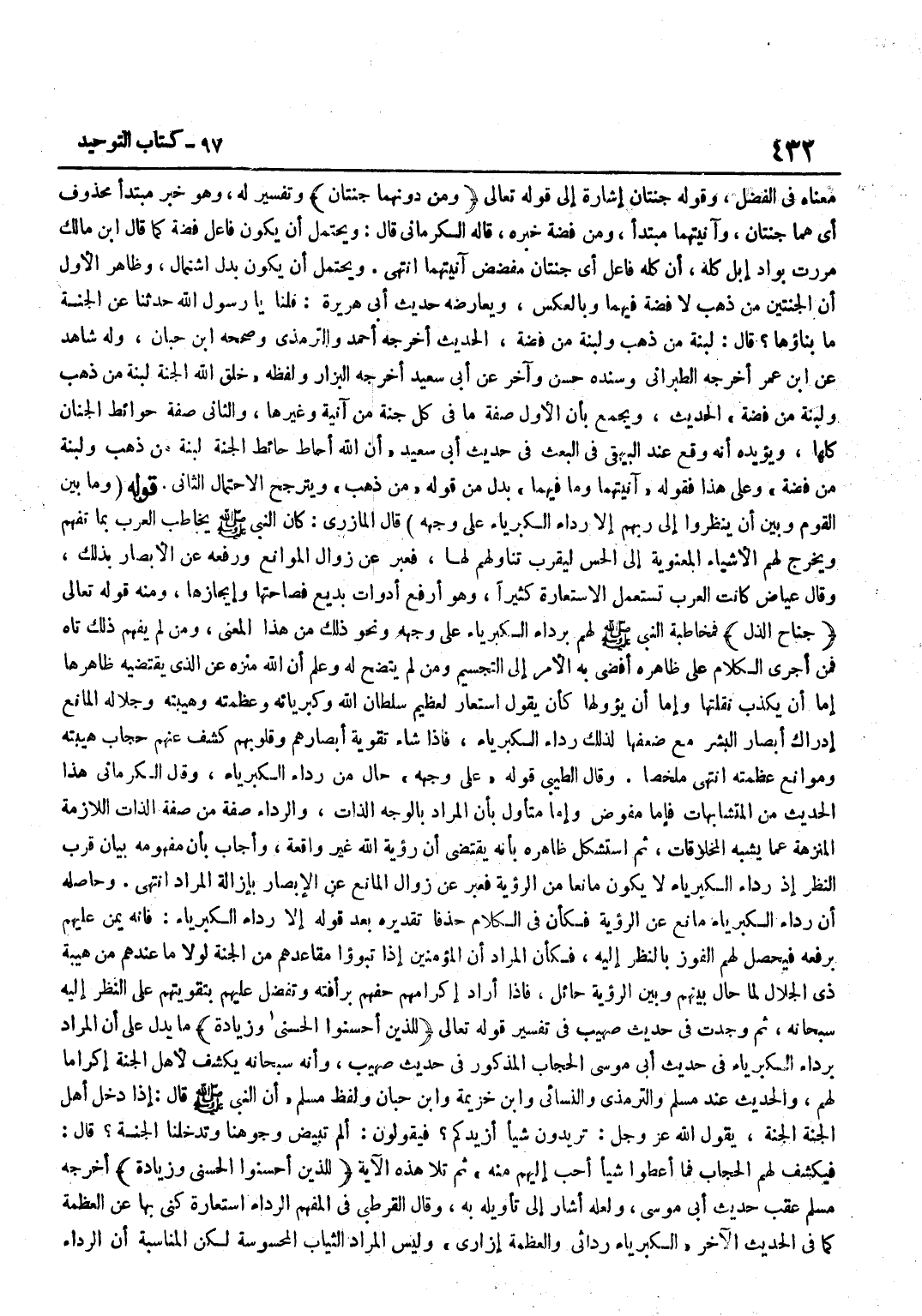 مَعْنَاهُ فِي الْفَضْلِ وَقَوْلُهُ جَنَّتَانِ إِشَارَةٌ إِلَى قَوْله تَعَالَى وَمن دونهمَا جنتان وَتَفْسِيرٌ لَهُ وَهُوَ خَبَرُ مُبْتَدَإٍ مَحْذُوفٍ أَيْ هُمَا جَنَّتَانِ وَآنِيَتُهُمَا مُبْتَدَأٌ وَمِنْ فِضَّةٍ خَبَرُهُ قَالَهُ الْكِرْمَانِيُّ قَالَ وَيَحْتَمِلُ أَنْ يَكُونَ فَاعِلُ فضَّة كَمَا قَالَ بن مَالِكٍ مَرَرْتُ بِوَادِ إِبِلٍ كُلُّهُ أَنَّ كُلُّهُ فَاعِلٌ أَيْ جَنَّتَانِ مُفَضَّضٌ آنِيَتُهُمَا انْتَهَى وَيَحْتَمِلُ أَنْ يَكُونَ بَدَلَ اشْتِمَالٍ وَظَاهِرُ الْأَوَّلِ أَنَّ الْجَنَّتَيْنِ مِنْ ذَهَبٍ لَا فِضَّةٍ فِيهِمَا وَبِالْعَكْسِ وَيُعَارِضُهُ حَدِيثُ أَبِي هُرَيْرَةَ قُلْنَا يَا رَسُولَ اللَّهِ حَدِّثْنَا عَنِ الْجَنَّةِ مَا بِنَاؤُهَا قَالَ لبنة من ذهب ولبنة من فضَّة الحَدِيث أخرجه احْمَد وَالتِّرْمِذِيّ وَصَححهُ بن حبَان وَله شَاهد عَن بن عُمَرَ أَخْرَجَهُ الطَّبَرَانِيُّ وَسَنَدُهُ حَسَنٌ وَآخَرُ عَنْ أَبِي سَعِيدٍ أَخْرَجَهُ الْبَزَّارُ وَلَفْظُهُ خَلَقَ اللَّهُ الْجنَّة لبنة من ذهب ولبنة من فضَّة الْحَدِيثَ وَيُجْمَعُ بِأَنَّ الْأَوَّلَ صِفَةُ مَا فِي كُلِّ جَنَّةٍ مِنْ آنِيَةٍ وَغَيْرِهَا وَالثَّانِي صِفَةُ حَوَائِطِ الْجِنَانِ كُلِّهَا وَيُؤَيِّدُهُ أَنَّهُ وَقَعَ عِنْدَ الْبَيْهَقِيِّ فِي الْبَعْثِ فِي حَدِيثِ أَبِي سَعِيدٍ أَنَّ اللَّهَ أَحَاطَ حَائِطَ الْجَنَّةِ لَبِنَةً مِنْ ذَهَبٍ وَلَبِنَةً مِنْ فِضَّةٍ وَعَلَى هَذَا فَقَوْلُهُ آنِيَتُهُمَا وَمَا فِيهِمَا بَدَلٌ مِنْ قَوْلِهِ مِنْ ذَهَبٍ وَيَتَرَجَّحُ الِاحْتِمَالُ الثَّانِي قَوْلُهُ وَمَا بَيْنَ الْقَوْمِ وَبَيْنَ أَنْ يَنْظُرُوا إِلَى رَبِّهِمْ إِلَّا رِدَاءُ الْكِبْرِيَاءِ عَلَى وَجْهِهِ قَالَ الْمَازِرِيُّ كَانَ النَّبِيُّ صَلَّى اللَّهُ عَلَيْهِ وَسَلَّمَ يُخَاطِبُ الْعَرَبَ بِمَا تَفْهَمُ وَيُخْرِجُ لَهُمُ الْأَشْيَاءَ الْمَعْنَوِيَّةَ إِلَى الْحِسِّ لِيُقَرِّبَ تَنَاوُلَهُمْ لَهَا فَعَبَّرَ عَنْ زَوَالِ الْمَوَانِعِ وَرَفْعِهِ عَنِ الْأَبْصَارِ بِذَلِكَ وَقَالَ عِيَاضٌ كَانَتِ الْعَرَبُ تَسْتَعْمِلُ الِاسْتِعَارَةَ كَثِيرًا وَهُوَ أَرْفَعُ أَدَوَاتِ بَدِيعِ فَصَاحَتِهَا وَإِيجَازِهَا وَمِنْهُ قَوْلُهُ تَعَالَى جنَاح الذل فَمُخَاطَبَةُ النَّبِيِّ صَلَّى اللَّهُ عَلَيْهِ وَسَلَّمَ لَهُمْ بِرِدَاءِ الْكِبْرِيَاءِ عَلَى وَجْهِهِ وَنَحْوِ ذَلِكَ مِنْ هَذَا الْمَعْنَى وَمَنْ لَمْ يَفْهَمْ ذَلِكَ تَاهَ فَمَنْ أَجْرَى الْكَلَامَ عَلَى ظَاهِرِهِ أَفْضَى بِهِ الْأَمْرُ إِلَى التَّجْسِيمِ وَمَنْ لَمْ يَتَّضِحْ لَهُ وَعَلِمَ أَنَّ اللَّهَ مُنَزَّهٌ عَنِ الَّذِي يَقْتَضِيهِ ظَاهِرُهَا إِمَّا أَنْ يُكَذِّبَ نَقَلَتَهَا وَإِمَّا أَنْ يُؤَوِّلَهَا كَأَنْ يَقُولَ اسْتَعَارَ لِعَظِيمِ سُلْطَانِ اللَّهِ وَكِبْرِيَائِهِ وَعَظَمَتِهِ وَهَيْبَتِهِ وَجَلَالِهِ الْمَانِعِ إِدْرَاكَ أَبْصَارِ الْبَشَرِ مَعَ ضَعْفِهَا لِذَلِكَ رِدَاءَ الْكِبْرِيَاءِ فَإِذَا شَاءَ تَقْوِيَةَ أَبْصَارِهُمْ وَقُلُوبِهِمْ كَشَفَ عَنْهُمْ حِجَابَ هَيْبَتِهِ وَمَوَانِعَ عَظَمَتِهِ انْتَهَى مُلَخَّصًا وَقَالَ الطِّيبِيُّ قَوْلُهُ عَلَى وَجْهِهِ حَالٌ مِنْ رِدَاءِ الْكِبْرِيَاءِ وَقَالَ الْكِرْمَانِيُّ هَذَا الْحَدِيثُ مِنَ الْمُتَشَابِهَاتِ فَإِمَّا مُفَوَّضٌ وَإِمَّا مُتَأَوَّلٌ بِأَنَّ الْمُرَادَ بِالْوَجْهِ الذَّاتُ وَالرِّدَاءُ صِفَةٌ مِنْ صِفَةِ الذَّاتِ اللَّازِمَةِ الْمُنَزَّهَةِ عَمَّا يُشْبِهُ الْمَخْلُوقَاتِ ثُمَّ اسْتَشْكَلَ ظَاهِرَهُ بِأَنَّهُ يَقْتَضِي أَنَّ رُؤْيَةَ اللَّهِ غَيْرُ وَاقِعَةٍ وَأَجَابَ بِأَنَّ مَفْهُومَهُ بَيَانُ قُرْبِ النَّظَرِ إِذْ رِدَاءُ الْكِبْرِيَاءِ لَا ي