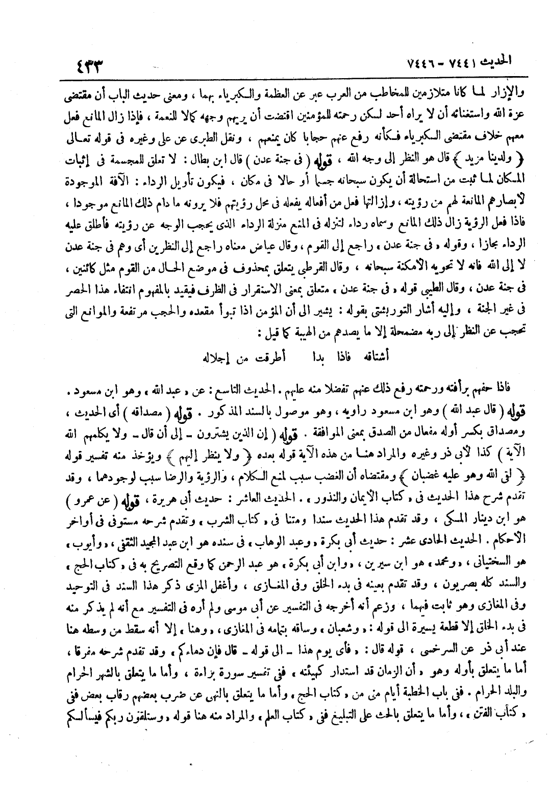 وَالْإِزَارَ لَمَّا كَانَا مُتَلَازِمَيْنِ لِلْمُخَاطَبِ مِنَ الْعَرَبِ عَبَّرَ عَنِ الْعَظَمَةِ وَالْكِبْرِيَاءِ بِهِمَا وَمَعْنَى حَدِيثِ الْبَابِ أَنَّ مُقْتَضَى عِزَّةِ اللَّهِ وَاسْتِغْنَائِهِ أَنْ لَا يَرَاهُ أَحَدٌ لَكِنَّ رَحْمَتَهُ لِلْمُؤْمِنِينَ اقْتَضَتْ أَنْ يُرِيَهُمْ وَجْهَهُ كَمَالًا لِلنِّعْمَةِ فَإِذَا زَالَ الْمَانِعُ فَعَلَ مَعَهُمْ خِلَافَ مُقْتَضَى الْكِبْرِيَاءِ فَكَأَنَّهُ رَفَعَ عَنْهُمْ حِجَابًا كَانَ يَمْنَعُهُمْ وَنَقَلَ الطَّبَرِيُّ عَنْ عَلِيٍّ وَغَيْرِهِ فِي قَوْلِهِ تَعَالَى وَلَدَيْنَا مزِيد قَالَ هُوَ النَّظَرُ إِلَى وَجْهِ اللَّهِ قَوْلُهُ فِي جنَّة عدن قَالَ بن بَطَّالٍ لَا تَعَلُّقَ لِلْمُجَسِّمَةِ فِي إِثْبَاتِ الْمَكَانِ لِمَا ثَبَتَ مِنَ اسْتِحَالَةِ أَنْ يَكُونَ سُبْحَانَهُ جِسْمًا أَوْ حَالًا فِي مَكَانٍ فَيَكُونُ تَأْوِيلُ الرِّدَاءِ الْآفَةُ الْمَوْجُودَةُ لِأَبْصَارِهِمُ الْمَانِعَةُ لَهُمْ مِنْ رُؤْيَتِهِ وَإِزَالَتُهَا فِعْلٌ مِنْ أَفْعَالِهِ يَفْعَلُهُ فِي مَحَلِّ رُؤْيَتِهِمْ فَلَا يَرَوْنَهُ مَا دَامَ ذَلِكَ الْمَانِعُ مَوْجُودًا فَإِذَا فَعَلَ الرُّؤْيَةَ زَالَ ذَلِكَ الْمَانِعُ وَسَمَّاهُ رِدَاءً لِتَنَزُّلِهِ فِي الْمَنْعِ مَنْزِلَةَ الرِّدَاءِ الَّذِي يَحْجُبُ الْوَجْهَ عَنْ رُؤْيَتِهِ فَأَطْلَقَ عَلَيْهِ الرِّدَاءَ مَجَازًا وَقَوْلُهُ فِي جَنَّةِ عَدْنٍ رَاجِعٌ إِلَى الْقَوْمِ وَقَالَ عِيَاضٌ مَعْنَاهُ رَاجِعٌ إِلَى النظرين أَيْ وَهُمْ فِي جَنَّةِ عَدْنٍ لَا إِلَى اللَّهِ فَإِنَّهُ لَا تَحْوِيهِ الْأَمْكِنَةُ سُبْحَانَهُ وَقَالَ الْقُرْطُبِيُّ يَتَعَلَّقُ بِمَحْذُوفٍ فِي مَوْضِعِ الْحَالِ مِنَ الْقَوْمِ مِثْلَ كَائِنِينَ فِي جَنَّةِ عَدْنٍ وَقَالَ الطِّيبِيُّ قَوْلُهُ فِي جَنَّةِ عَدْنٍ مُتَعَلِّقٌ بِمَعْنَى الِاسْتِقْرَارِ فِي الظَّرْفِ فَيُقَيَّدُ بِالْمَفْهُومِ انْتِفَاءُ هَذَا الْحَصْرِ فِي غَيْرِ الْجَنَّةِ وَإِلَيْهِ أَشَارَ التُّورْبَشْتِيُّ بِقَوْلِهِ يُشِيرُ إِلَى أَنَّ الْمُؤْمِنَ إِذَا تَبَوَّأَ مَقْعَدَهُ وَالْحُجُبُ مُرْتَفِعَةٌ وَالْمَوَانِعُ الَّتِي تَحْجُبُ عَنِ النَّظَرِ إِلَى رَبِّهِ مُضْمَحِلَّةٌ إِلَّا مَا يَصُدُّهُمْ مِنَ الْهَيْبَةِ كَمَا قِيلَ أَشْتَاقُهُ فَإِذَا بَدَا أَطْرَقْتُ مِنْ إِجْلَالِهِ فَإِذَا حَفَّهُمْ بِرَأْفَتِهِ وَرَحْمَتِهِ رَفَعَ ذَلِكَ عَنْهُمْ تَفَضُّلًا مِنْهُ عَلَيْهِمْ الْحَدِيثُ التَّاسِع عَن عبد الله وَهُوَ بن مَسْعُود