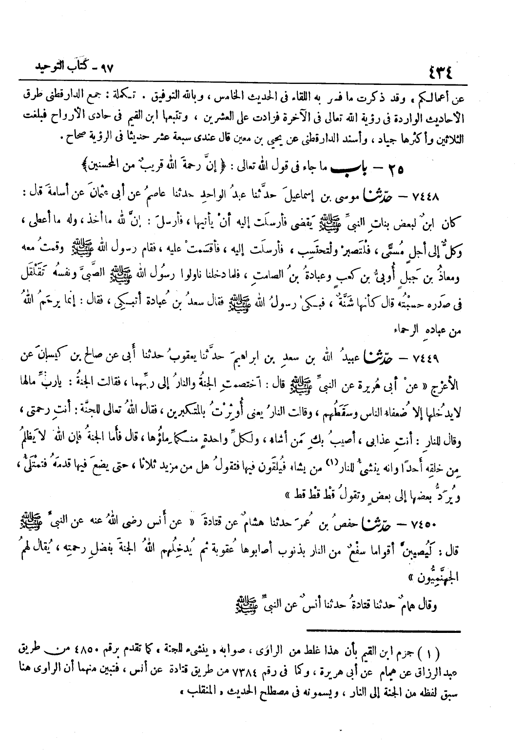 عَنْ أَعْمَالِكُمْ وَقَدْ ذَكَرْتُ مَا فُسِّرَ بِهِ اللِّقَاءُ فِي الْحَدِيثِ الْخَامِسِ وَبِاللَّهِ التَّوْفِيقُ تَكْمِلَةٌ جَمَعَ الدَّارَقُطْنِيُّ طُرُقَ الْأَحَادِيثِ الْوَارِدَةِ فِي رُؤْيَةِ اللَّهِ تَعَالَى فِي الْآخِرَةِ فَزَادَتْ عَلَى الْعِشْرِينَ وتتبعها بن الْقَيِّمِ فِي حَادِي الْأَرْوَاحِ فَبَلَغَتِ الثَّلَاثِينَ وَأَكْثَرُهَا جِيَادٌ وَأَسْنَدَ الدَّارَقُطْنِيُّ عَنْ يَحْيَى بْنِ مَعِينٍ قَالَ عِنْدِي سَبْعَةَ عَشَرَ حَدِيثًا فِي الرُّؤْيَةِ صِحَاح