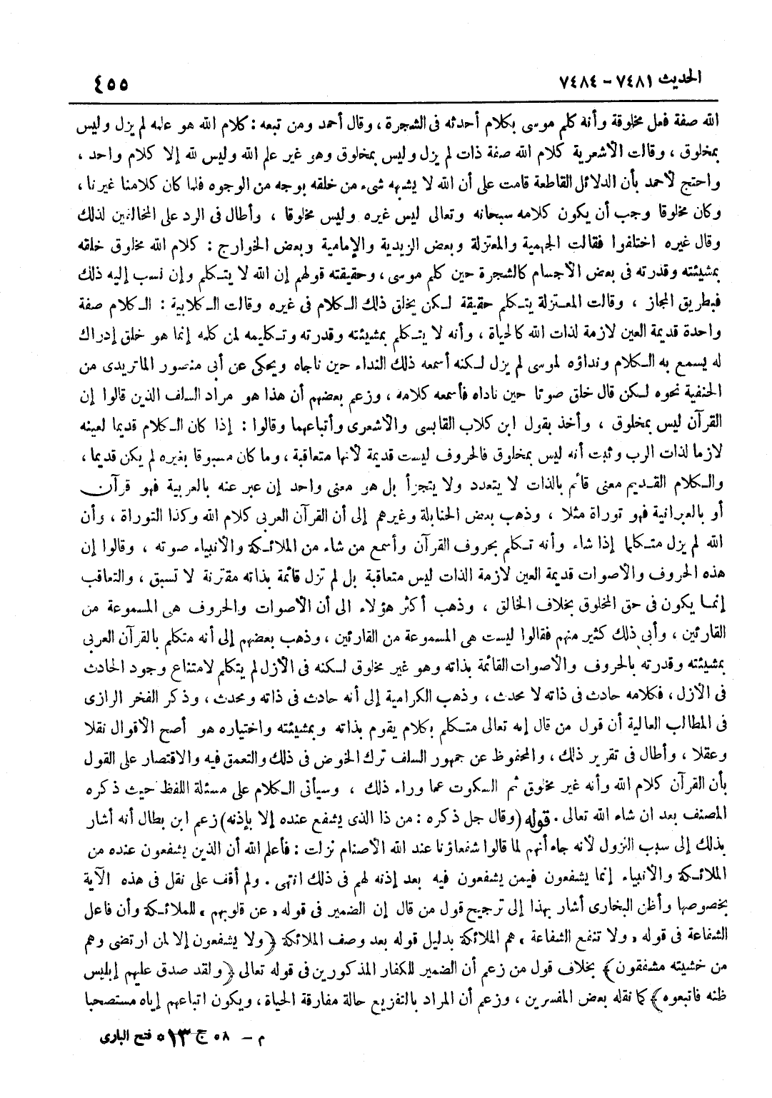 اللَّهِ صِفَةُ فِعْلٍ مَخْلُوقَةٌ وَأَنَّهُ كَلَّمَ مُوسَى بِكَلَامٍ أَحْدَثَهُ فِي الشَّجَرَةِ وَقَالَ أَحْمَدُ وَمَنْ تَبِعَهُ كَلَامُ اللَّهِ هُوَ عِلْمُهُ لَمْ يَزَلْ وَلَيْسَ بِمَخْلُوقٍ وَقَالَتِ الْأَشْعَرِيَّةُ كَلَامُ اللَّهِ صِفَةُ ذَاتٍ لَمْ يَزَلْ وَلَيْسَ بِمَخْلُوقٍ وَهُوَ غَيْرُ عِلْمِ اللَّهِ وَلَيْسَ لِلَّهِ إِلَّا كَلَامٌ وَاحِدٌ وَاحْتُجَّ لِأَحْمَدَ بِأَنَّ الدَّلَائِلَ الْقَاطِعَةَ قَامَتْ عَلَى أَنَّ اللَّهَ لَا يُشْبِهُهُ شَيْءٌ مِنْ خَلْقِهِ بِوَجْهٍ مِنَ الْوُجُوهِ فَلَمَّا كَانَ كَلَامُنَا غَيْرَنَا وَكَانَ مَخْلُوقًا وَجَبَ أَنْ يَكُونَ كَلَامُهُ سُبْحَانَهُ وَتَعَالَى لَيْسَ غَيْرَهُ وَلَيْسَ مَخْلُوقًا وَأَطَالَ فِي الرَّدِّ عَلَى الْمُخَالِفِينَ لِذَلِكَ وَقَالَ غَيْرُهُ اخْتَلَفُوا فَقَالَتِ الْجَهْمِيَّةُ وَالْمُعْتَزِلَةُ وَبَعْضُ الزَّيْدِيَّةِ وَالْإِمَامِيَّةُ وَبَعْضُ الْخَوَارِجِ كَلَامُ اللَّهِ مَخْلُوقٌ خَلَقَهُ بِمَشِيئَتِهِ وَقُدْرَتِهِ فِي بَعْضِ الْأَجْسَامِ كَالشَّجَرَةِ حِينَ كَلَّمَ مُوسَى وَحَقِيقَتُهُ قَوْلُهُمْ إِنَّ اللَّهَ لَا يَتَكَلَّمُ وَإِنْ نُسِبَ إِلَيْهِ ذَلِكَ فَبِطَرِيقِ الْمَجَازِ وَقَالَتِ الْمُعْتَزِلَةُ يَتَكَلَّمُ حَقِيقَةً لَكِنْ يَخْلُقُ ذَلِكَ الْكَلَامَ فِي غَيْرِهِ وَقَالَتِ الْكِلَابِيَّةُ الْكَلَامُ صِفَةٌ وَاحِدَةٌ قَدِيمَةُ الْعَيْنِ لَازِمَةٌ لِذَاتِ اللَّهِ كَالْحَيَاةِ وَأَنَّهُ لَا يَتَكَلَّمُ بِمَشِيئَتِهِ وَقُدْرَتِهِ وَتَكْلِيمِهِ لِمَنْ كَلَّمَهُ إِنَّمَا هُوَ خَلْقُ إِدْرَاكٍ لَهُ يَسْمَعُ بِهِ الْكَلَامَ وَنِدَاؤُهُ لِمُوسَى لَمْ يَزَلْ لَكِنَّهُ أَسْمَعَهُ ذَلِكَ النِّدَاءَ حِينَ نَاجَاهُ وَيُحْكَى عَنْ أَبِي مَنْصُورٍ الْمَاتُرِيدِيِّ مِنَ الْحَنَفِيَّةِ نَحْوُهُ لَكِنْ قَالَ خَلَقَ صَوْتًا حِينَ نَادَاهُ فَأَسْمَعَهُ كَلَامَهُ وَزَعَمَ بَعْضُهُمْ أَنَّ هَذَا هُوَ مُرَادُ السَّلَفِ الَّذِينَ قَالُوا ان الْقُرْآن لَيْسَ بمخلوق وَأخذ بقول بن كِلَابٍ الْقَابِسِيِّ وَالْأَشْعَرِيِّ وَأَتْبَاعِهِمَا وَقَالُوا إِذَا كَانَ الْكَلَامُ قَدِيمًا لِعَيْنِهِ لَازِمًا لِذَاتِ الرَّبِّ وَثَبَتَ أَنَّهُ لَيْسَ بِمَخْلُوقٍ فَالْحُرُوفُ لَيْسَتْ قَدِيمَةً لِأَنَّهَا مُتَعَاقِبَةٌ وَمَا كَانَ مَسْبُوقًا بِغَيْرِهِ لَمْ يَكُنْ قَدِيمًا وَالْكَلَامُ الْقَدِيمُ مَعْنًى قَائِمٌ بِالذَّاتِ لَا يَتَعَدَّدُ وَلَا يَتَجَزَّأُ بَلْ هُوَ مَعْنًى وَاحِدٌ إِنْ عَبَّرَ عَنْهُ بِالْعَرَبِيَّةِ فَهُوَ قُرْآنٌ أَوْ بِالْعِبْرَانِيَّةِ فَهُوَ تَوْرَاةٌ مَثَلًا وَذَهَبَ بَعْضُ الْحَنَابِلَةِ وَغَيْرُهُمْ إِلَى أَنَّ الْقُرْآنَ الْعَرَبِيَّ كَلَامُ اللَّهِ وَكَذَا التَّوْرَاةُ وَأَنَّ اللَّهَ لَمْ يَزَلْ مُتَكَلِّمًا إِذَا شَاءَ وَأَنَّهُ تَكَلَّمَ بِحُرُوفِ الْقُرْآنِ وَأَسْمَعَ مَنْ شَاءَ مِنَ الْمَلَائِكَةِ وَالْأَنْبِيَاءِ صَوْتَهُ وَقَالُوا إِنَّ هَذِهِ الْحُرُوفَ وَالْأَصْوَاتَ قَدِيمَةُ الْعَيْنِ لَازِمَةُ الذَّات لَيْسَ مُتَعَاقِبَةً بَلْ لَمْ تَزَلْ قَائِمَةً بِذَاتِهِ مُقْتَرِنَةً لَا تُسْبَقُ وَالتَّعَاقُبُ إِنَّمَا يَكُونُ فِي حَقِّ الْمَخْلُوقِ بِخِلَافِ الْخَالِقِ وَذَهَبَ أَكْثَرُ هَؤُلَاءِ إِلَى أَنَّ الْأَصْوَاتَ وَالْحُرُوفَ هِيَ الْمَسْمُوعَةُ مِنَ الْقَارِئِينَ وَأَبَى ذَلِكَ كَثِيرٌ مِنْهُمْ فَقَالُوا لَيْسَتْ هِيَ الْمَسْمُوعَةُ مِنَ الْقَارِئِينَ وَذَهَبَ بَعْضُهُمْ إِلَى أَنَّهُ مُتَكَلِّمٌ بِالْقُرْآنِ الْعَرَبِيِّ بِمَشِيئَتِهِ وَقُدْرَتِهِ بِالْحُرُوفِ وَالْأَصْوَاتِ الْقَائِمَةِ بِذَاتِهِ وَهُوَ غَيْرُ مَخْلُوقٍ لَكِنَّهُ فِي الْأَزَلِ لَم