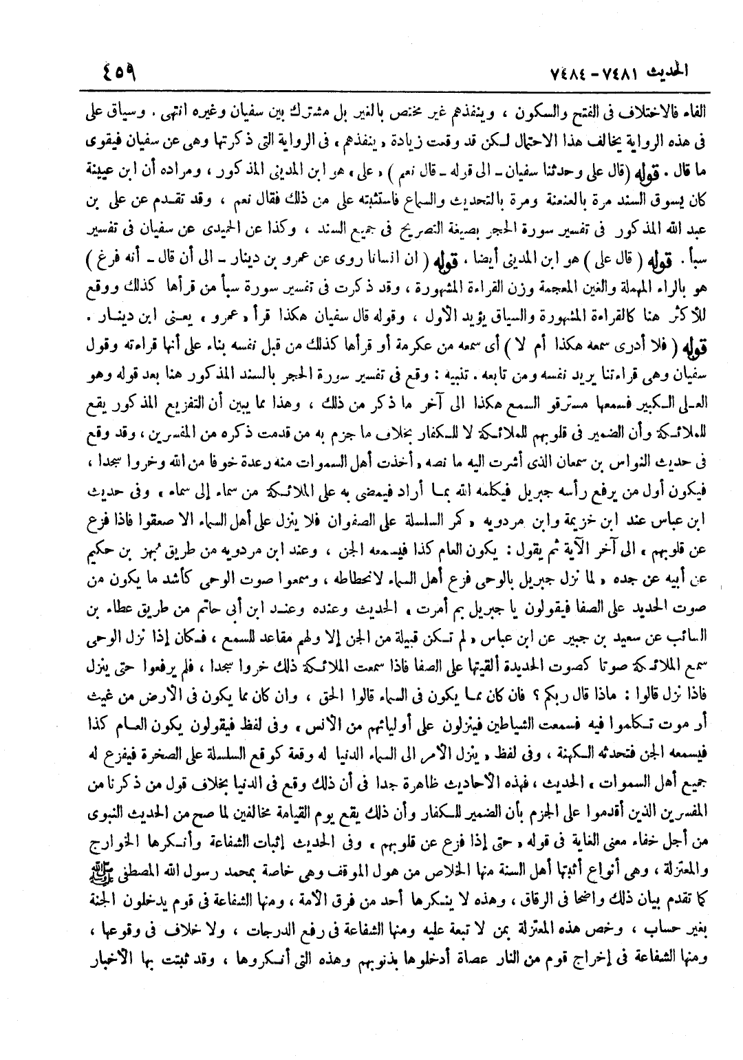 الْفَاءِ فَالِاخْتِلَافُ فِي الْفَتْحِ وَالسُّكُونِ وَيَنْفُذُهُمْ غَيْرُ مُخْتَصٍّ بِالْغَيْرِ بَلْ مُشْتَرِكٌ بَيْنَ سُفْيَانَ وَغَيْرِهِ انْتَهَى وَسِيَاقُ عَلِيٍّ فِي هَذِهِ الرِّوَايَةِ يُخَالِفُ هَذَا الِاحْتِمَالَ لَكِنْ قَدْ وَقَعَتْ زِيَادَةُ يَنْفُذُهُمْ فِي الرِّوَايَةِ الَّتِي ذَكَرْتُهَا وَهِيَ عَنْ سُفْيَانَ فَيَقْوَى مَا قَالَ قَوْلُهُ قَالَ عَلِيٌّ وَحَدَّثَنَا سُفْيَانُ إِلَى قَوْلِهِ قَالَ نَعَمْ عَلِيٌّ هُوَ بن الْمَدِينِيّ الْمَذْكُور وَمرَاده ان بن عُيَيْنَةَ كَانَ يَسُوقُ السَّنَدَ مَرَّةً بِالْعَنْعَنَةِ وَمَرَّةً بِالتَّحْدِيثِ وَالسَّمَاعِ فَاسْتَثْبَتَهُ عَلِيٌّ مِنْ ذَلِكَ فَقَالَ نَعَمْ وَقَدْ تَقَدَّمَ عَنْ عَلِيِّ بْنِ عَبْدِ اللَّهِ الْمَذْكُورِ فِي تَفْسِيرِ سُورَةِ الْحِجْرِ بِصِيغَةِ التَّصْرِيحِ فِي جَمِيعِ السَّنَدِ وَكَذَا عَنِ الْحُمَيْدِيِّ عَنْ سُفْيَانَ فِي تَفْسِيرِ سَبَإٍ قَوْلُهُ قَالَ عَليّ هُوَ بن الْمَدِينِيِّ أَيْضًا قَوْلُهُ إِنَّ إِنْسَانًا رَوَى عَنْ عَمْرِو بْنِ دِينَارٍ إِلَى أَنْ قَالَ أَنَّهُ فَرَغَ هُوَ بِالرَّاءِ الْمُهْمَلَةِ وَالْغَيْنِ الْمُعْجَمَةِ وَزْنُ الْقِرَاءَةِ الْمَشْهُورَةِ وَقَدْ ذَكَرْتُ فِي تَفْسِيرِ سُورَةِ سَبَإٍ مَنْ قَرَأَهَا كَذَلِكَ وَوَقَعَ لِلْأَكْثَرِ هُنَا كَالْقِرَاءَةِ الْمَشْهُورَةِ وَالسِّيَاقُ يُؤَيِّدُ الْأَوَّلَ وَقَوْلُهُ قَالَ سُفْيَان هَكَذَا قَرَأَ عَمْرو يَعْنِي بن دِينَارٍ قَوْلُهُ فَلَا أَدْرِي سَمِعَهُ هَكَذَا أَمْ لَا أَيْ سَمِعَهُ مِنْ عِكْرِمَةَ أَوْ قَرَأَهَا كَذَلِكَ مِنْ قِبَلِ نَفْسِهِ بِنَاءً عَلَى أَنَّهَا قِرَاءَتُهُ وَقَوْلُ سُفْيَانَ وَهِيَ قِرَاءَتُنَا يُرِيدُ نَفْسَهُ وَمَنْ تَابَعَهُ تَنْبِيهٌ وَقَعَ فِي تَفْسِيرِ سُورَةِ الْحِجْرِ بِالسَّنَدِ الْمَذْكُورِ هُنَا بَعْدَ قَوْلِهِ وَهُوَ الْعلي الْكَبِير فَسَمِعَهَا مُسْتَرِقُو السَّمْعِ هَكَذَا إِلَى آخِرِ مَا ذُكِرَ مِنْ ذَلِكَ وَهَذَا مِمَّا يُبَيِّنُ أَنَّ التَّفْزِيعَ الْمَذْكُورَ يَقَعُ لِلْمَلَائِكَةِ وَأَنَّ الضَّمِيرَ فِي قُلُوبِهِمْ لِلْمَلَائِكَةِ لَا لِلْكُفَّارِ بِخِلَافِ مَا جَزَمَ بِهِ مَنْ قَدَّمْتُ ذِكْرَهُ مِنَ الْمُفَسِّرِينَ وَقَدْ وَقَعَ فِي حَدِيثِ النَّوَّاسِ بْنِ سَمْعَانَ الَّذِي أَشَرْتُ إِلَيْهِ مَا نَصُّهُ أَخَذَتْ أَهْلُ السَّمَاوَاتِ مِنْهُ رِعْدَةً خَوْفًا مِنَ اللَّهِ وَخَرُّوا سُجَّدًا فَيَكُونُ أَوَّلُ مَنْ يَرْفَعُ رَأْسَهُ جِبْرِيلُ فَيُكَلِّمُهُ اللَّهُ بِمَا أَرَادَ فَيَمْضِي بِهِ عَلَى الْمَلَائِكَةِ من سَمَاء إِلَى سَمَاء وَفِي حَدِيث بن عَبَّاس عِنْد بن خُزَيْمَة وبن مَرْدَوَيْهِ كَمَرِّ السِّلْسِلَةِ عَلَى الصَّفْوَانِ فَلَا يَنْزِلُ على أهل السَّمَاء الا صعقوا فَإِذا فزع عَن قُلُوبهم إِلَى آخِرِ الْآيَةِ ثُمَّ يَقُولُ يَكُونُ الْعَامُ كَذَا فيسمعه الْجِنّ وَعند بن مَرْدَوَيْهِ مِنْ طَرِيقِ بَهْزُ بْنُ حَكِيمٍ عَنْ أَبِيهِ عَنْ جَدِّهِ لَمَّا نَزَلَ جِبْرِيلُ بِالْوَحْيِ فَزِعَ أَهْلُ السَّمَاءِ لِانْحِطَاطِهِ وَسَمِعُوا صَوْتَ الْوَحْيِ كَأَشَدِّ مَا يَكُونُ مِنْ صَوْتِ الْحَدِيدِ عَلَى الصَّفَا فَيَقُولُونَ يَا جِبْرِيلُ بِمَ أُمِرْتَ الْحَدِيثَ وَعِنْده وَعند بن أَبِي حَاتِمٍ مِنْ طَرِيقِ عَطَاءِ بْنِ السَّائِبِ عَنْ سَعِيدِ بْنِ جُبَيْرٍ عَن بن عَبَّاسٍ لَمْ تَكُنْ قَبِيلَةٌ مِنَ الْجِنِّ إِلَّا وَلَهُمْ مَقَاعِدُ لِلسَّمْعِ فَكَانَ إِذَا نَزَلَ الْوَحْيُ سَمِعَ الْمَلَائِكَةُ صَوْتًا كَصَوْتِ الْحَدِيدَةِ أَلْقَيْتَهَا عَلَى الصَّفَا فَإِذَا سَمِعَتِ الْمَلَائِكَةُ ذَلِكَ خَرُّوا سُجَّدًا فَلَمْ يَرْفَعُوا حَتَّى يَنْزِلَ فَإِذَا ن