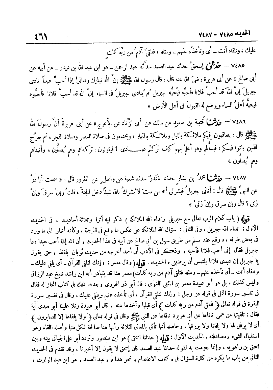 ذَكَرَ فِيهِ أَثَرًا وَثَلَاثَةَ أَحَادِيث فِي الْحَدِيثِ الْأَوَّلِ نِدَاءُ اللَّهِ جِبْرِيلَ وَفِي الثَّانِي سُؤَالُ اللَّهِ الْمَلَائِكَةَ عَلَى عَكْسِ مَا وَقَعَ فِي التَّرْجَمَةِ وَكَأَنَّهُ أَشَارَ إِلَى مَا وَرَدَ فِي بَعْضِ طُرُقِهِ وَوَقَعَ عِنْدَ مُسْلِمٍ مِنْ طَرِيقِ سُهَيْلِ بْنِ أَبِي صَالِحٍ عَنْ أَبِيهِ فِي هَذَا الْحَدِيثِ أَنَّ اللَّهَ إِذَا أَحَبَّ عَبْدًا دَعَا جِبْرِيلَ فَقَالَ إِنِّي أُحِبُّ فُلَانًا فَأَحِبَّهُ وَذَكَرَ فِي الْأَدَبِ أَنَّ أَحْمَدَ أَخْرَجَهُ مِنْ حَدِيثِ ثَوْبَانَ بِلَفْظِ حَتَّى يَقُولَ يَا جِبْرِيلُ إِنَّ عَبْدِي فُلَانًا يَلْتَمِسُ أَنْ يُرْضِيَنِي الْحَدِيثَ قَوْلُهُ وَقَالَ مَعْمَرٌ وَإِنَّكَ لَتُلَقَّى الْقُرْآنَ أَيْ يُلْقَى عَلَيْكَ وَتَلَقَّاهُ أَنْتَ أَيْ تَأْخُذُهُ عَنْهُمْ وَمِثْلُهُ فَتَلَقَّى آدَمُ مِنْ رَبِّهِ كَلِمَاتٍ معمر هَذَا قد يتَبَادَر انه بن رَاشِدٍ شَيْخُ عَبْدِ الرَّزَّاقِ وَلَيْسَ كَذَلِكَ بَلْ هُوَ أَبُو عُبَيْدَةَ مَعْمَرُ بْنُ الْمُثَنَّى اللُّغَوِيُّ قَالَ أَبُو ذَرٍّ الْهَرَوِيُّ وَجَدْتُ ذَلِكَ فِي كِتَابِ الْمَجَازِ لَهُ فَقَالَ فِي تَفْسِيرِ سُورَةِ النَّمْلِ فِي قَوْلِهِ عَزَّ وَجَلَّ وَإِنَّكَ لَتُلَقَّى الْقُرْآن أَيْ تَأْخُذُهُ عَنْهُمْ وَيُلْقَى عَلَيْكَ وَقَالَ فِي تَفْسِيرِ سُورَةِ الْبَقَرَةِ فِي قَوْلِهِ تَعَالَى فَتَلَقَّى آدم من ربه كَلِمَات أَيْ قَبِلَهَا وَأَخَذَهَا عَنْهُ قَالَ أَبُو عُبَيْدَةَ وَتَلَا عَلَيْنَا أَبُو مَهْدِيٍّ آيَةً فَقَالَ تَلَقَّيْتُهَا مِنْ عَمِّي تَلَقَّاهَا عَنْ أَبِي هُرَيْرَةَ تَلَقَّاهَا عَنِ النَّبِيِّ صَلَّى اللَّهُ عَلَيْهِ وَسَلَّمَ وَقَالَ فِي قَوْلِهِ تَعَالَى وَلَا يُلَقَّاهَا إِلَّا الصَّابِرُونَ أَيْ لَا يُوَفَّقُ لَهَا وَلَا يُلَقَّنُهَا وَلَا يُرْزَقُهَا وَحَاصِلُهُ أَنَّهَا تَأْتِي بِالْمَعَانِي الثَّلَاثَةِ وَأَنَّهَا هُنَا صَالِحَةٌ لِكُلٍّ مِنْهَا وَأَصْلُهُ اللِّقَاءُ وَهُوَ اسْتِقْبَالُ الشَّيْءِ وَمُصَادَفَتُهُ الْحَدِيثُ الْأَوَّلُ