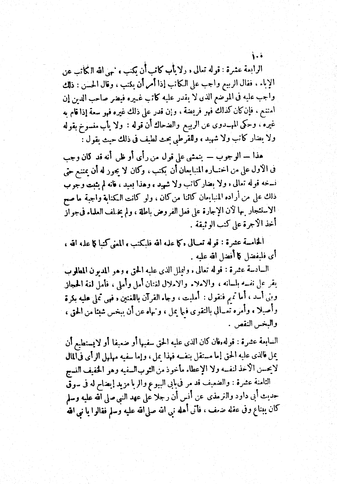 ولا يضار كاتب ولا شهيد " وللقرطبي بحث لطيف في ذلك حيث يقول: هذا - الوجوب - يتمشى على قول من رأى أو ظن أنه قد كان وجب في الاول على من اختاره المتبايعان أن يكتب، وكان لا يجوز له أن يمتنع حتى نسخه قوله تعالى " ولا يضار كاتب ولا شهيد " وهذا بعيد، فانه لم يثبت وجوب ذلك على من أراده المتبايعان كائنا من كان، ولو كانت الكتابة واجبة ما صح الاستئجار بها لان الاجارة على فعل الفروض باطلة، ولم يخلف العلماء في جواز أخذ الاجرة على كتب الوثيقة.