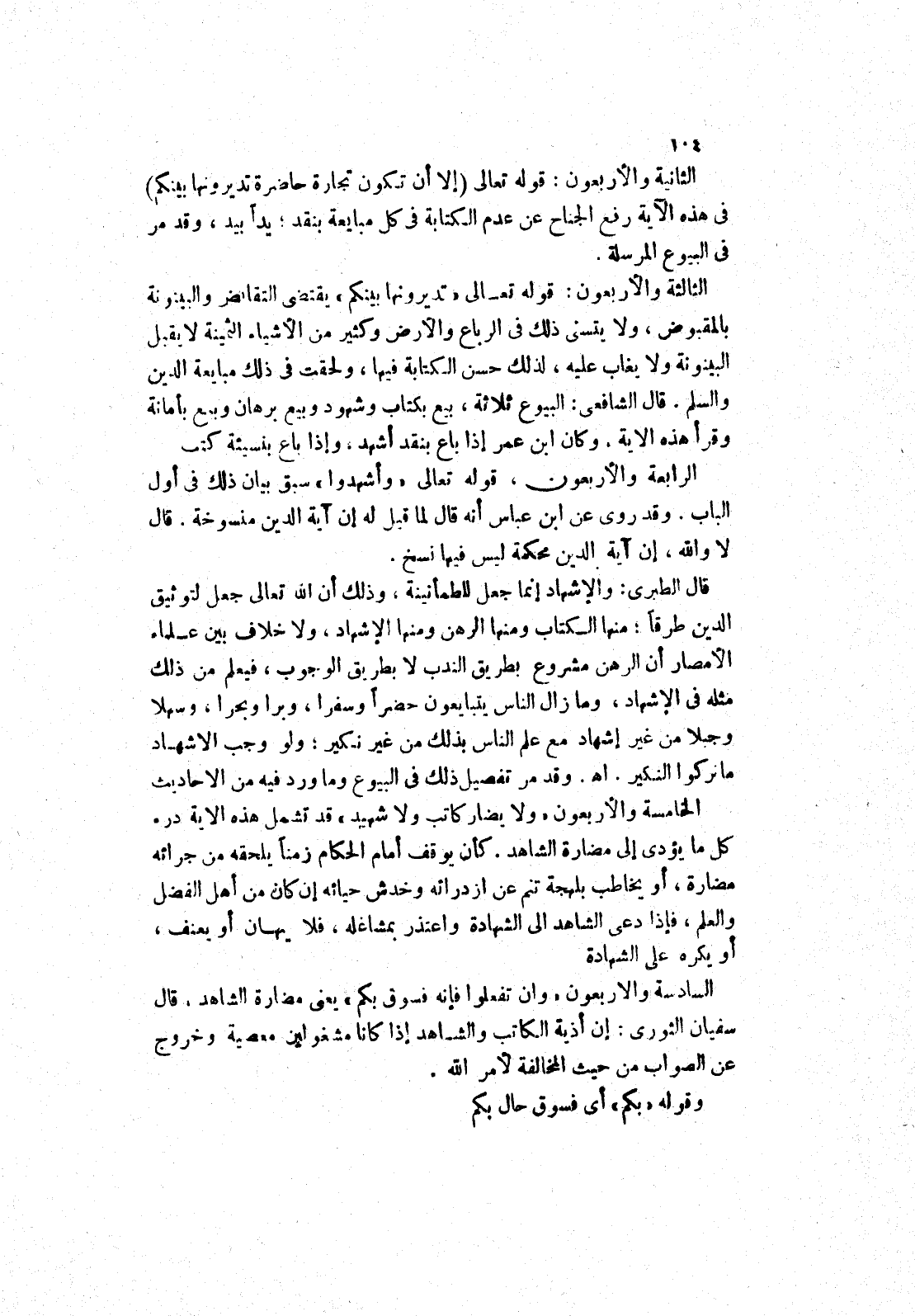 قال الشافعي: البيوع ثلاثة، بيع بكتاب وشهود وبيع برهان وبيع بأمانة وقرأ هذه الاية، وَكَانَ ابْنُ عُمَرَ إذَا بَاعَ بِنَقْدٍ أَشْهَدَ، وإذا باع بنسيئة كتب الرابعة والاربعون، قوله تعالى " وأشهدوا " سبق بيان ذلك في أول
