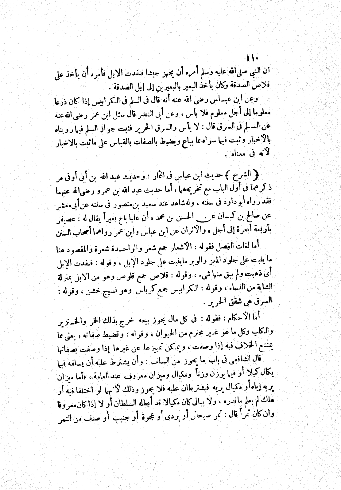 (الشرح) حديث ابن عباس في الثمار، وحديث عبد الله بن أبى أوفى مر ذكرهما في أول الباب مع تخريجهما، أما حديث عبد الله بن عمرو رضى الله عنهما فقد رواه أبو داود في سننه، وله شاهد عند سعيد بن منصور في سننه عن أبى معشر عن صالح بن كيسان عن الحسن بن محمد " أن عليا باع بعيرا يقال له: عصيفر بأربعة أبعرة إلى أجل " والاثران عن ابن عباس وابن عمر رواهما أصحاب السنن أما لغات الفصل فقوله: الاشعار جمع شعر والواحدة شعرة والمقصود هنا ما ينبت على جلود المعز والوبر ما ينبت على جلود الابل، وقوله: فنفدت الابل أي ذهبت ولم يبق منها شئ، وقوله: قلاص جمع قلوص وهو من الابل بمنزلة الشابة من النساء، وقوله: الكرابيس جمع كرباس وهو نسيج خشن، وقوله: السرق هي شقق الحرير.
