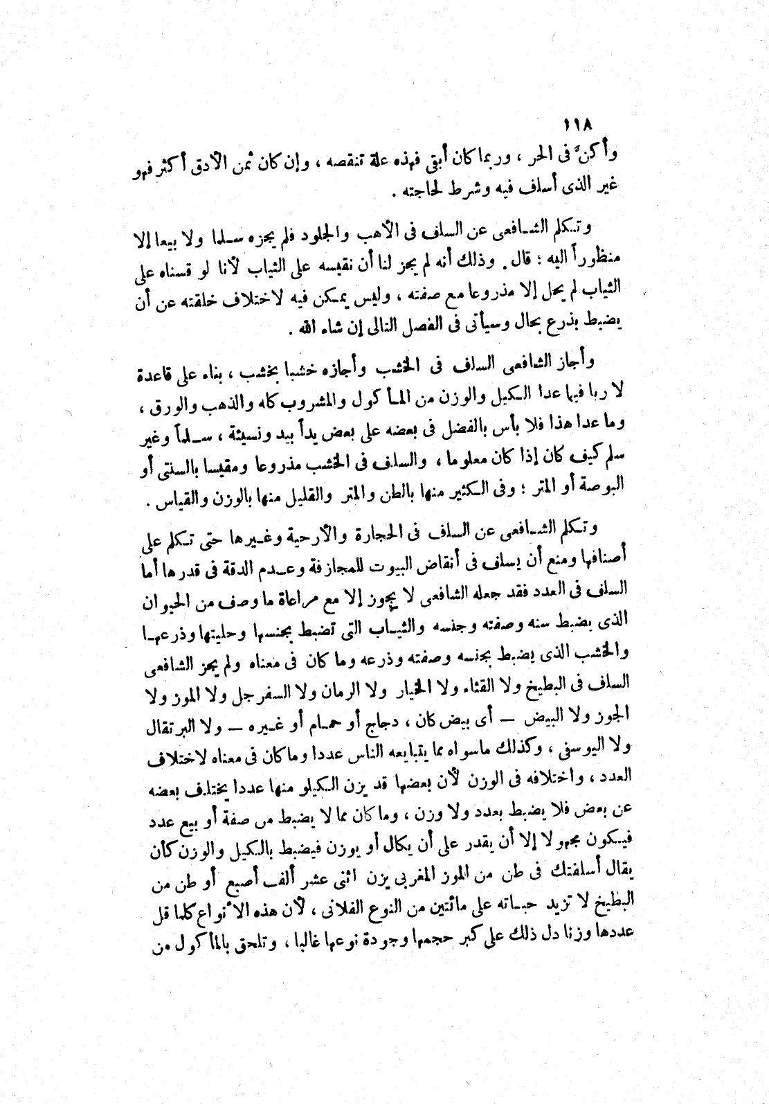 وتكلم الشافعي عن السلف في الحجارة والارحية وغيرها حتى تكلم على أصنافها ومنع أن يسلف في أنقاض البيوت للمجازفة وعدم الدقة في قدرها أما السلف في العدد فقد جعله الشافعي لا يجوز إلا مع مراعاة ما وصف من الحيوان الذى يضبط سنه وصفته وجنسه والثياب التى تضبط بجنسها وحليتها وذرعها والخشب الذى يضبط بجنسه وصفته وذرعه وما كان في معناه ولم يجز الشافعي السلف في البطيخ ولا القثاء ولا الخيار ولا الرمان ولا السفرجل ولا الموز ولا الجوز ولا البيض - أي بيض كان، دجاج أو حمام أو غيره - ولا البرتقال ولا اليوسفي، وكذلك ما سواه مما يتبايعه الناس عددا وما كان في معناه لاختلاف العدد، واختلافه في الوزن لان بعضها قد يزن الكيلو منها عددا يختلف بعضه عن بعض فلا يضبط بعدد ولا وزن، وما كان مما لا يضبط من صفة أو بيع عدد