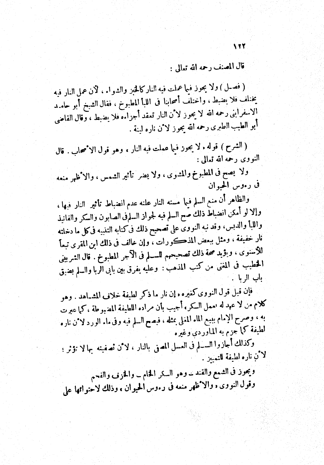 النووي رحمه الله تعالى: ولا يصح في المطبوخ والمشوى، ولا يضر تأثير الشمس، والاظهر منعه في رءوس الحيوان والظاهر أن منع السلم فيما مسته النار علته عدم انضباط تأثير النار فيها، وإلا لو أمكن انضباط ذلك صح السلم فيه لجواز السلم في الصابون والسكر والفانيذ واللبأ والدبس، وقد نبه النووي على تصحيح ذلك في كتابه التنبيه في كل ما دخلته نار خفيفة، ومثل ببعض المذكورات، وإن خالف في ذلك ابن المقرى تبعا للاسنوى، ويؤيد صحة ذلك تصحيحهم للسلم في الآجر المطبوخ.