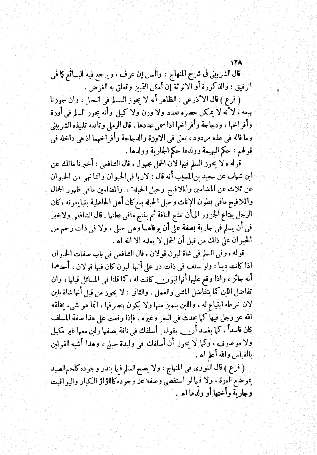 قوله " لا يجوز السلم فيها لان الحمل مجهول " قال الشافعي: أخبرنا مالك عن ابن شهاب عن سعيد بن المسيب أنه قال: لا ربا في الحيوان وانما نهى من الحيوان عن ثلاث عن المضامين والملاقيح وحبل الحبلة، والمضامين ما في ظهور الجمال والملاقيح ما في بطون الاناث وحبل الحبله بيع كان أهل الجاهلية يتبايعونه، كان الرجل يبتاع الجزور إلى أن تنتج الناقة ثم ينتج ما في بطنها.
