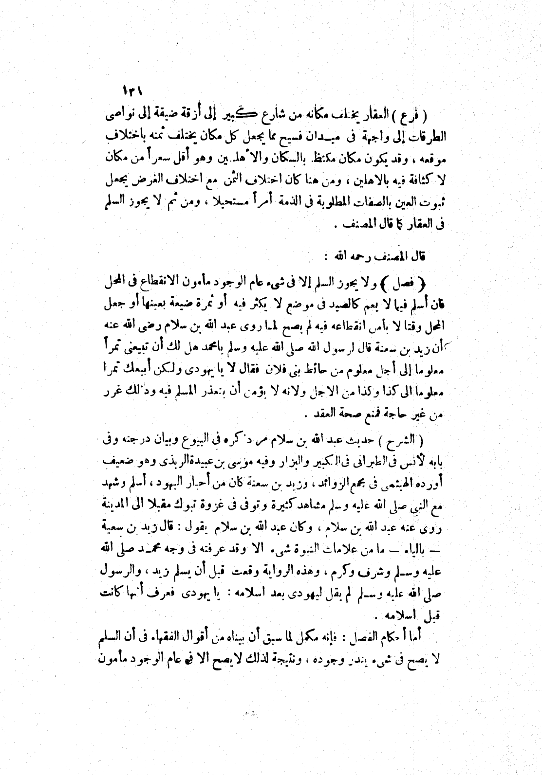 ولا يجوز السلم إلا في شئ عام الوجود مأمون الانقطاع في المحل فان أسلم فيما لا يعم كالصيد في موضع لا يكثر فيه أو ثمرة ضيعة بعينها أو جعل المحل وقتا لا يأمن انقطاعه فيه لم يصح لما روى عَبْدِ اللَّهِ بْنِ سَلَامٍ رَضِيَ اللَّهُ عَنْهُ أن زيد بن سعنة قَالَ لِرَسُولِ اللَّهِ صَلَّى اللَّهُ عَلَيْهِ وَسَلَّمَ يا محمد هل لك أن تبيعني تمرا معلوما إلى أجل معلوم من حائط بنى فلان فقال لا يا يهودى ولكن أبيعك تمرا معلوما إلى كذا وكذا من الاجل ولانه لا يؤمن أن يتعذر المسلم فيه وذلك غرر من غير حاجة فمنع صحة العقد.