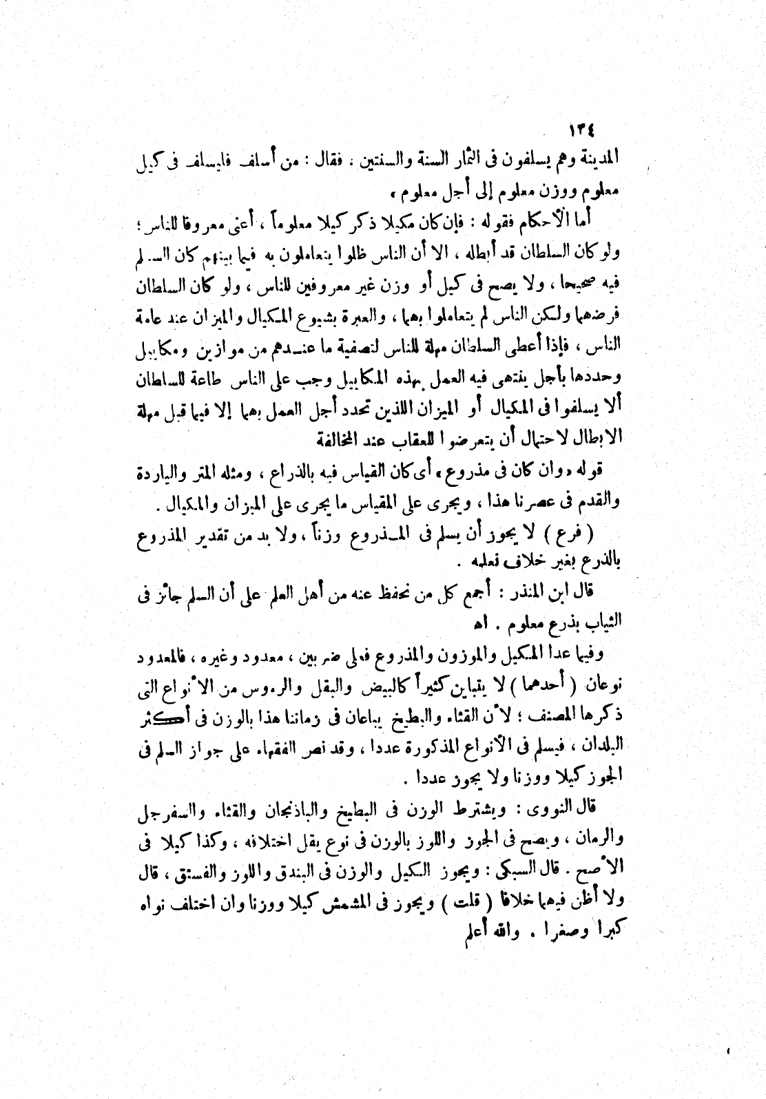 أما الاحكام فقوله: فإن كان مكيلا ذكر كيلا معلوما، أعنى معروفا للناس، ولو كان السلطان قد أبطله، الا أن الناس ظلوا يتعاملون به فيما بينهم كان السلم فيه صحيحا، ولا يصح في كيل أو وزن غير معروفين للناس، ولو كان السلطان فرضهما ولكن الناس لم يتعاملوا بهما، والعبرة بشيوع المكيال والميزان عند عامة الناس، فإذا أعطى السلطان مهلة للناس لتصفية ما عندهم من موازين ومكاييل وحددها بأجل ينتهى فيه العمل بهذه المكاييل وجب على الناس طاعة للسلطان ألا يسلفوا في المكيال أو الميزان اللذين تحدد أجل العمل بهما إلا فيما قبل مهلة الابطال لاحتمال أن يتعرضوا للعقاب عند المخالفة قوله " وان كان في مذروع " أي كان القياس فيه بالذراع، ومثله المتر والياردة والقدم في عصرنا هذا، ويجرى على المقياس ما يجرى على الميزان والمكيال.