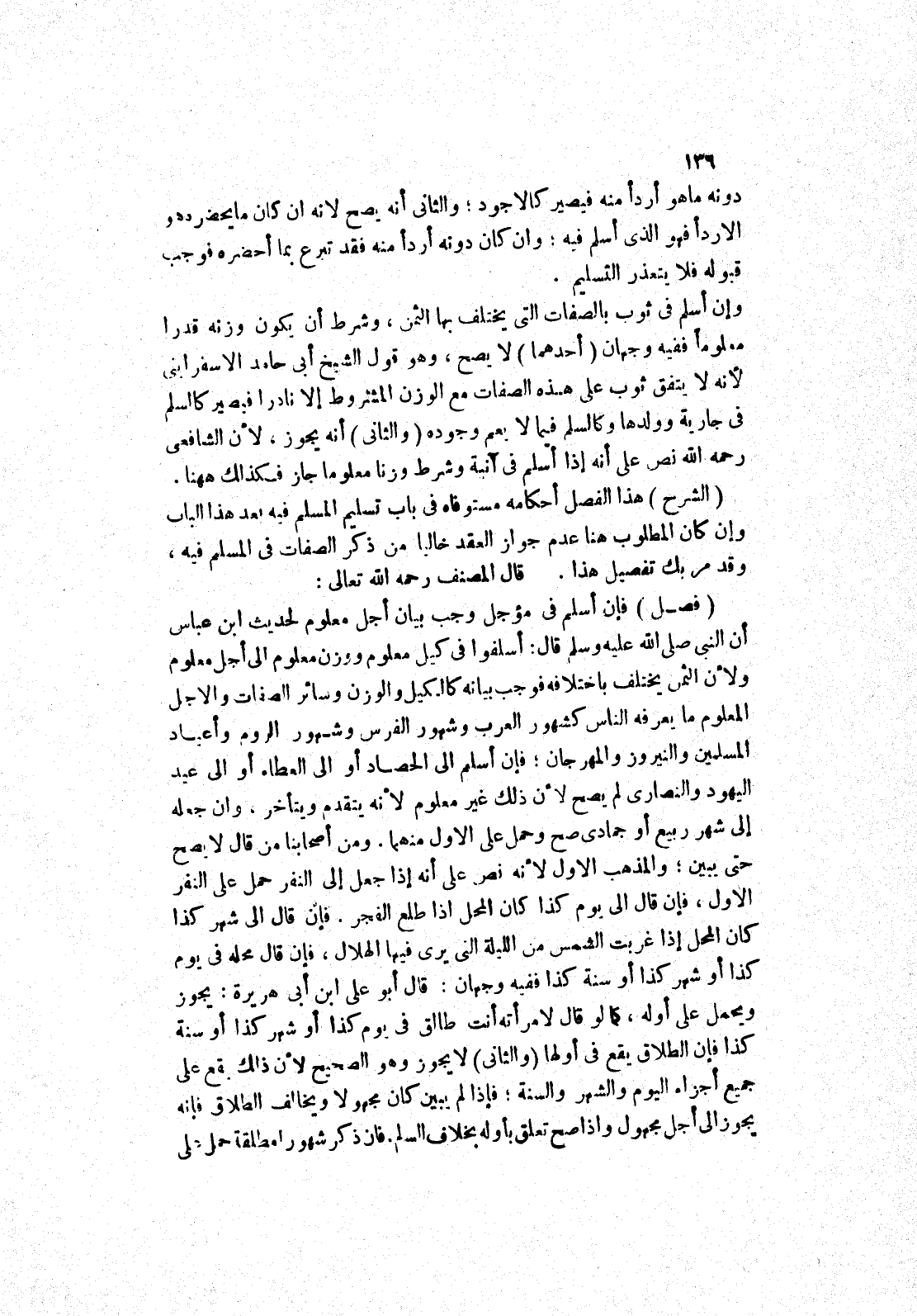 (الشرح) هذا الفصل أحكامه مستوفاة في باب تسليم المسلم فيه بعد هذا الباب وإن كان المطلوب هنا عدم جواز العقد خاليا من ذكر الصفات في المسلم فيه، وقد مر بك تفصيل هذا.
