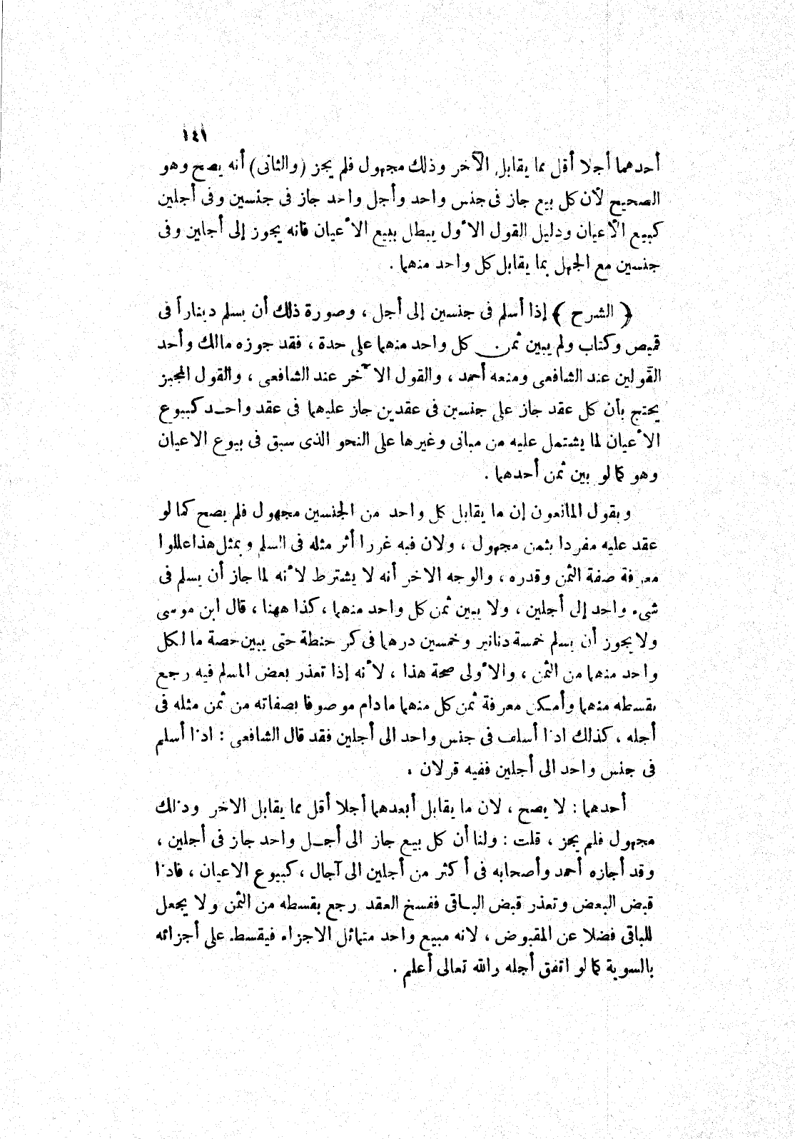 وبقول المانعون إن ما يقابل كل واحد من الجنسين مجهول فلم يصح كما لو عقد عليه مفردا بثمن مجهول، ولان فيه غررا أثر مثله في السلم وبمثل هذا عللوا معرفة صفة الثمن وقدره، والوجه الاخر أنه لا يشترط لانه لما جاز أن يسلم في شئ واحد إلى أجلين، ولا يبين ثمن كل واحد منهما، كذا ههنا، قال ابن موسى ولا يجوز أن يسلم خمسة دنانير وخمسين درهما في كر حنطة حتى يبين حصة ما لكل