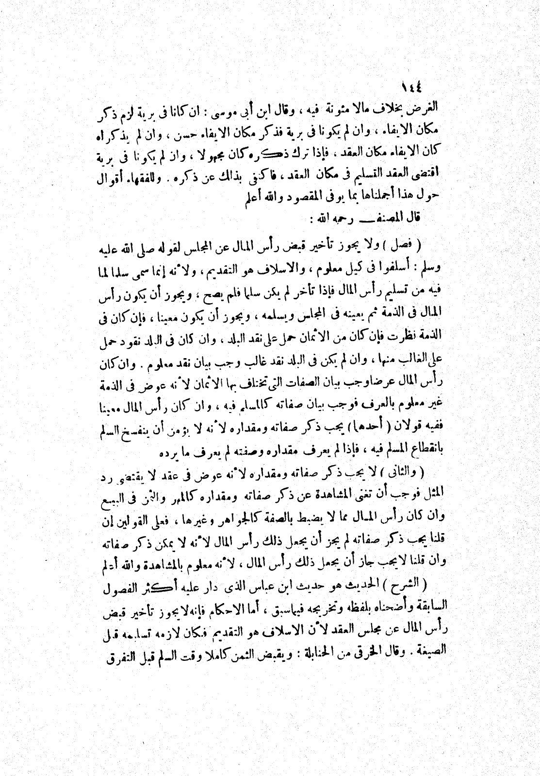 لا يجب ذكر صفاته ومقداره لانه عوض في عقد لا يقتضى رد المثل فوجب أن تغنى المشاهدة عن ذكر صفاته ومقداره كالمهر والثمن في البيع وان كان رأس المال مما لا يضبط بالصفة كالجواهر وغيرها، فعلى القولين إن قلنا يجب ذكر صفاته لم يجز أن يجعل ذلك رأس المال لانه لا يمكن ذكر صفاته وان قلنا لا يجب جاز أن يجعل ذلك رأس المال، لانه معلوم بالمشاهدة والله أعلم (الشرح) الحديث هو حديث ابن عباس الذى دار عليه أكثر الفصول السابقة وأضحناه بلفظه وتخريجه فيما سبق، أما الاحكام فإنه لا يجوز تأخير قبض رأس المال عن مجلس العقد لان الاسلاف هو التقديم فكان لازمه تسليمه قبل