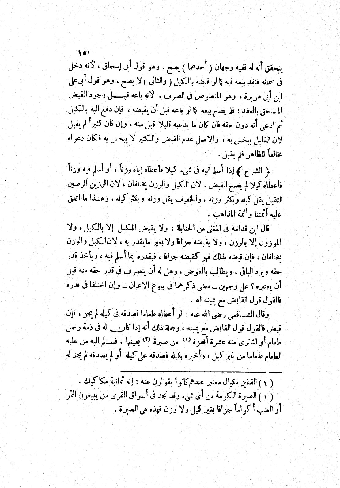 قال ابن قدامة في المغنى من الحنابلة: ولا يقبض المكيل إلا بالكيل، ولا الموزون إلا بالوزن، ولا يقبضه جزافا ولا بغير ما يقدر به، لان الكيل والوزن يختلفان، فإن قبضه بذلك فهو كقبضه جزافا، فيقدره بما أسلم فيه، ويأخذ قدر حقه ويرد الباقي، ويطالب بالعوض، وهل له أن يتصرف في قدر حقه منه قبل