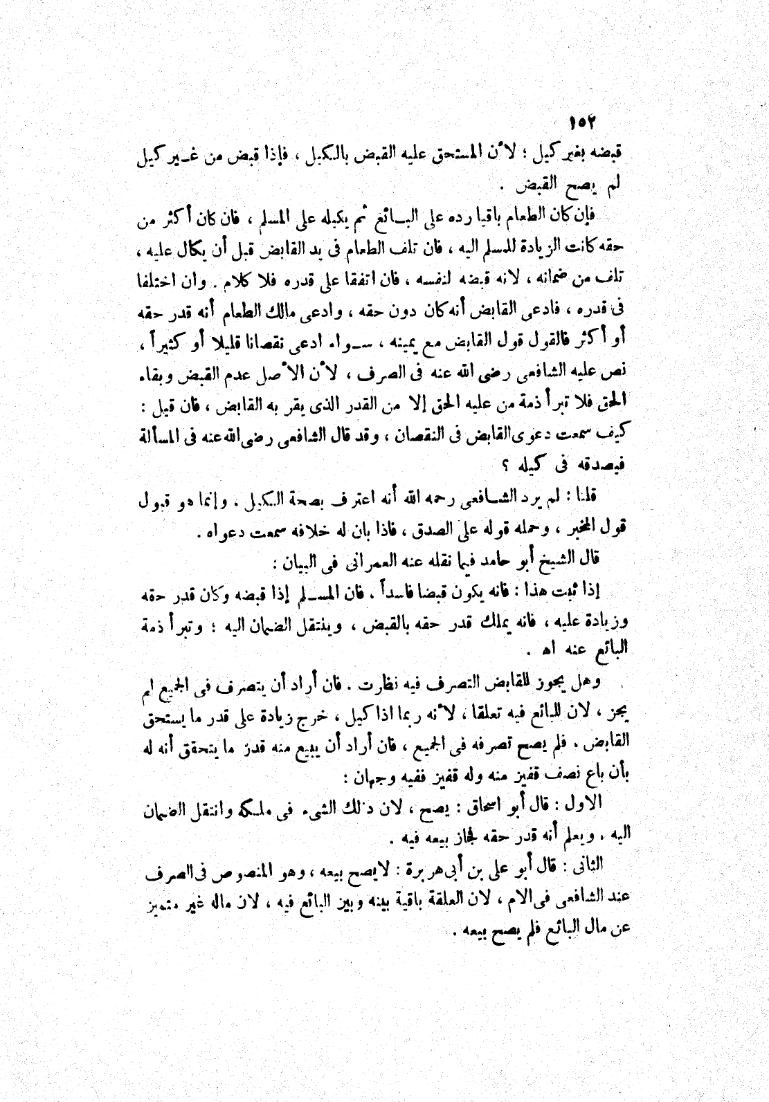 وان اختلفا في قدره، فادعى القابض أنه كان دون حقه، وادعى مالك الطعام أنه قدر حقه أو أكثر فالقول قول القابض مع يمينه، سواء ادعى نقصانا قليلا أو كثيرا، نَصَّ عَلَيْهِ الشَّافِعِيُّ رَضِيَ اللَّهُ عَنْهُ فِي الصرف، لان الاصل عدم القبض وبقاء الحق فلا تبرأ ذمة من عليه الحق إلا من القدر الذى يقر به القابض، فان قيل: كيف سمعت دعوى القابض في النقصان، وَقَدْ قَالَ الشَّافِعِيُّ رَضِيَ اللَّهُ عَنْهُ فِي المسألة فيصدقه في كيله؟ قلنا: لم يرد الشافعي رحمه الله أنه اعترف بصحة الكيل، وإنما هو قبول