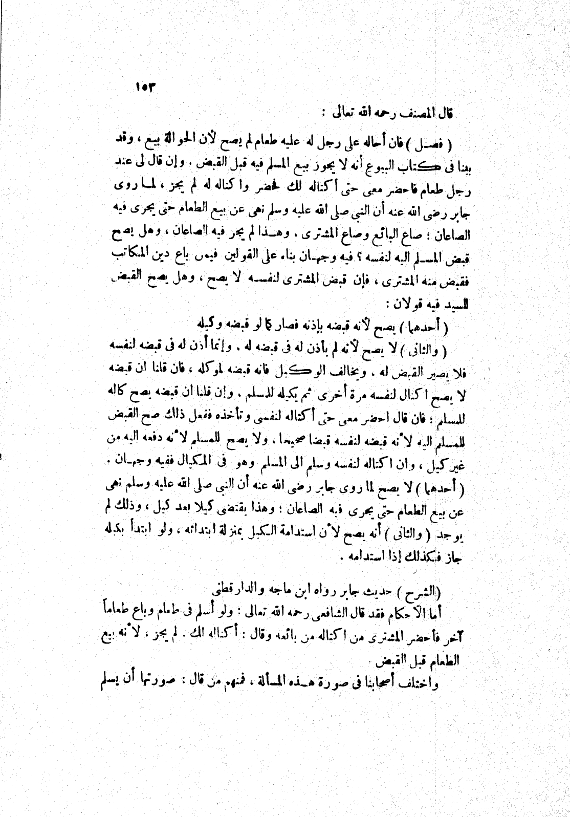 (الشرح) حديث جابر رواه ابن ماجه والدارقطني أما الاحكام فقد قال الشافعي رحمه الله تعالى: ولو أسلم في طعام وباع طعاما آخر فأحضر المشترى من اكتاله من بائعه وقال: أكتاله لك.