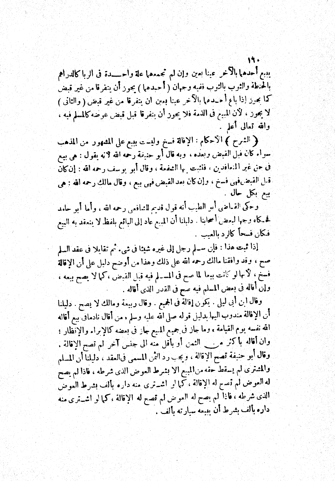 (الشرح) الاحكام: الاقالة فسخ وليست ببيع على المشهور من المذهب سواء كان قبل القبض وبعده، وبه قال أبو حنيفة رحمه الله لانه يقول: هي بيع في حق غير المتعاقدين، فتثبت بها الشفعة، وقال أبو يوسف رحمه الله: إن كان قبل القبض فهى فسخ، وإن كان بعد القبض فهى بيع، وقال مالك رحمه الله: هي بيع بكل حال.