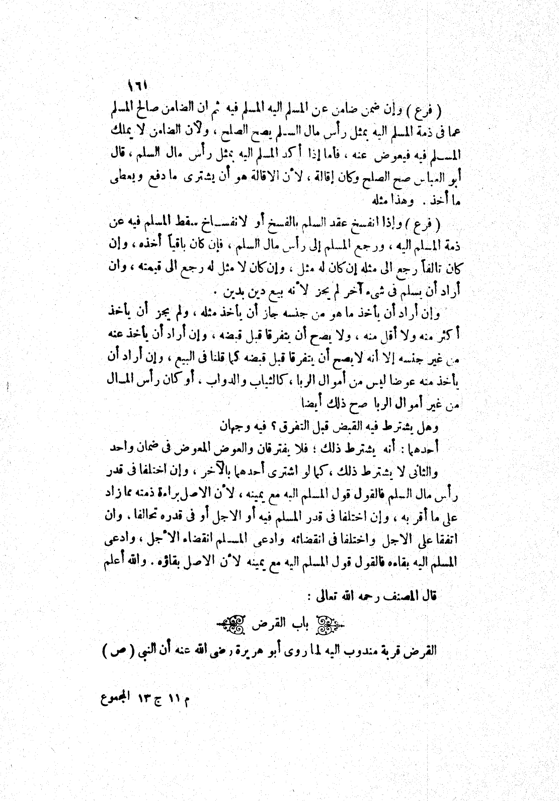 وإن أراد أن يأخذ ما هو من جنسه جاز أن يأخذ مثله، ولم يجز أن يأخذ أكثر منه ولا أقل منه، ولا يصح أن يتفرقا قبل قبضه، وإن أراد أن يأخذ عنه من غير جنسه إلا أنه لا يصح أن يتفرقا قبل قبضه كما قلنا في البيع، وإن أراد أن يأخذ منه عوضا ليس من أموال الربا، كالثياب والدواب، أو كان رأس المال من غير أموال الربا صح ذلك أيضا وهل يشترط فيه القبض قبل التفرق؟ فيه وجهان أحدهما: أنه يشترط ذلك، فلا يفترقان والعوض المعوض في ضمان واحد والثانى لا يشترط ذلك، كما لو اشترى أحدهما بالآخر، وإن اختلفا في قدر