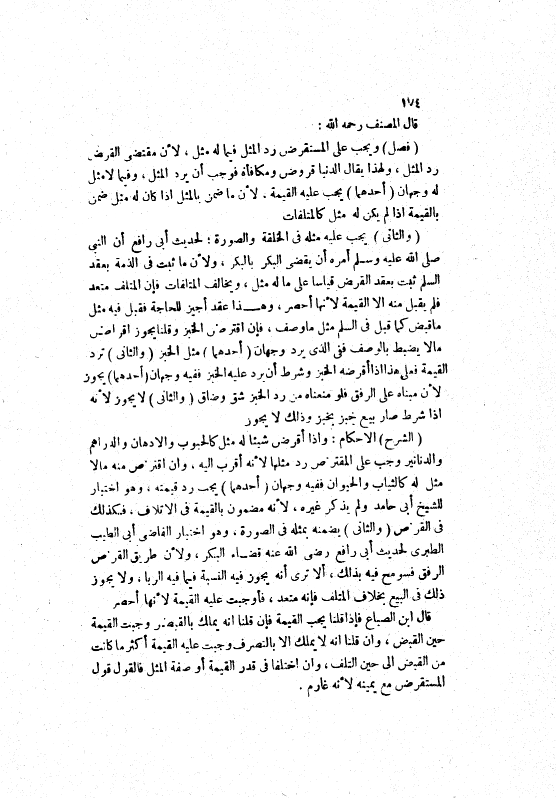(الشرح) الاحكام: وإذا أقرض شيئا له مثل كالحبوب والادهان والدراهم والدنانير وجب على المقترض رد مثلها لانه أقرب إليه، وان اقترض منه مالا مثل له كالثياب والحيوان ففيه وجهان