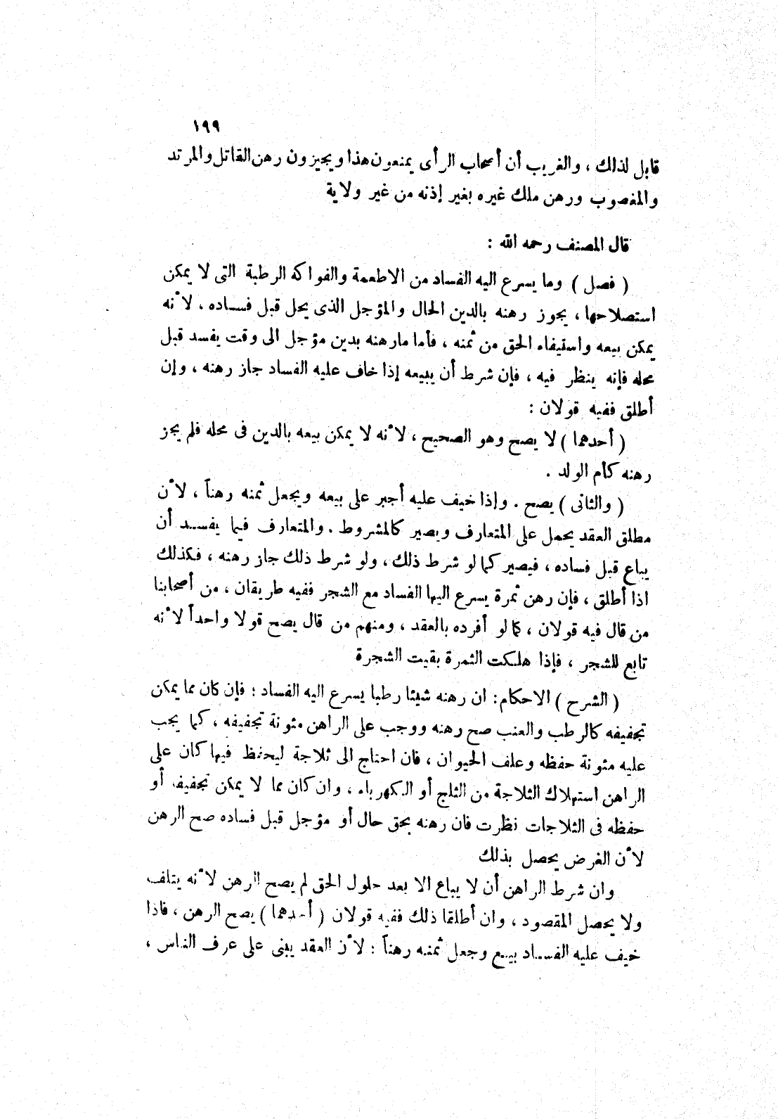 مِنْ قَالَ فِيهِ قَوْلَانِ، كما لو أفرده بالعقد، ومنهم من قال يصح قولا واحدا لانه تابع للشجر، فإذا هلكت الثمرة بقيت الشجرة (الشرح) الاحكام: ان رهنه شيئا رطبا يسرع إليه الفساد، فإن كان مما يمكن تجفيفه كالرطب والعنب صح رهنه ووجب على الراهن مئونة تجفيفه، كما يجب عليه مئونة حفظه وعلف الحيوان، فان احتاج إلى ثلاجة ليحفظ فيها كان على الراهن استهلاك الثلاجة من الثلج أو الكهرباء، وان كان مما لا يمكن تجفيفه أو حفظه في الثلاجات نظرت فان رهنه بحق حال أو مؤجل قبل فساده صح الرهن لان الغرض يحصل بذلك وان شرط الراهن أن لا يباع الا بعد حلول الحق لم يصح الرهن لانه يتلف ولا يحصل المقصود، وان أطلقا ذلك ففيه قولان