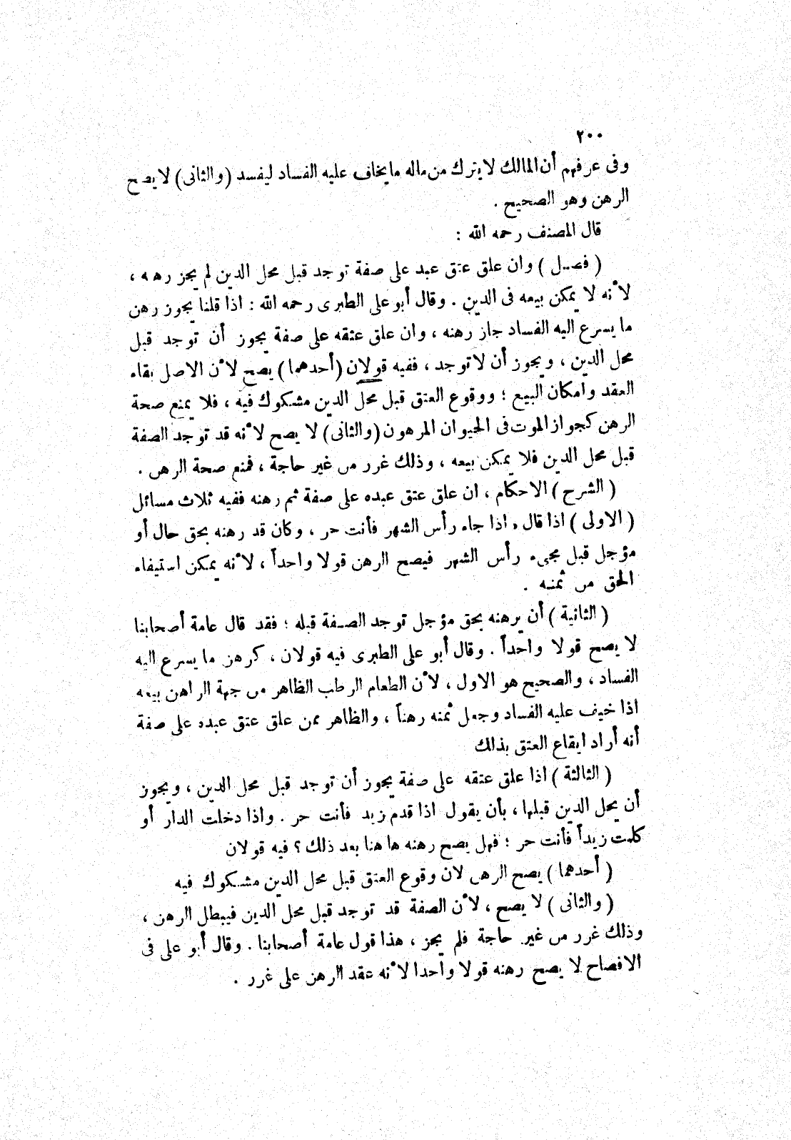 وقال أبو على الطبري فيه قولان، كرهن ما يسرع إليه الفساد، والصحيح هو الاول، لان الطعام الرطب الظاهر من جهة الراهن بيعه إذا خيف عليه الفساد وجعل ثمنه رهنا، والظاهر ممن علق عتق عبده على صفة أنه أراد ايقاع العتق بذلك (الثالثة) إذا علق عتقه على صفة يجوز أن توجد قبل محل الدين، ويجوز أن يحل الدين قبلها، بأن يقول إذا قدم زيد فأنت حر.