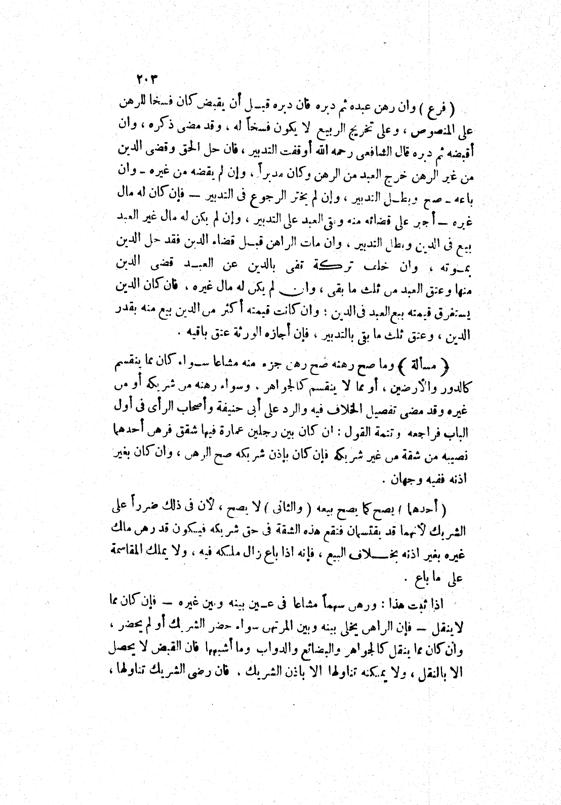 (مسألة) وما صح رهنه صح رهن جزء منه مشاعا سواء كان مما ينقسم كالدور والارضين، أو مما لا ينقسم كالجواهر، وسواء رهنه من شريكه أو من غيره وقد مضى تفصيل الخلاف فيه والرد على أبى حنيفة وأصحاب الرأى في أول الباب فراجعه وتتمة القول: ان كان بين رجلين عمارة فيها شقق فرهن أحدهما نصيبه من شقة من غير شريكه فإن كان بإذن شريكه صح الرهن، وان كان بغير اذنه ففيه وجهان.