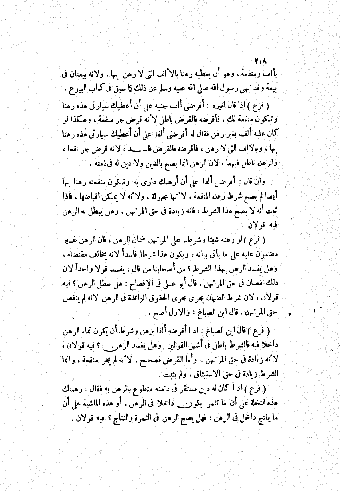 قال ابن الصباغ: إذا أقرضه ألفا برهن وشرط أن يكون نماء الرهن داخلا فيه فالشرط باطل في أشهر القولين.