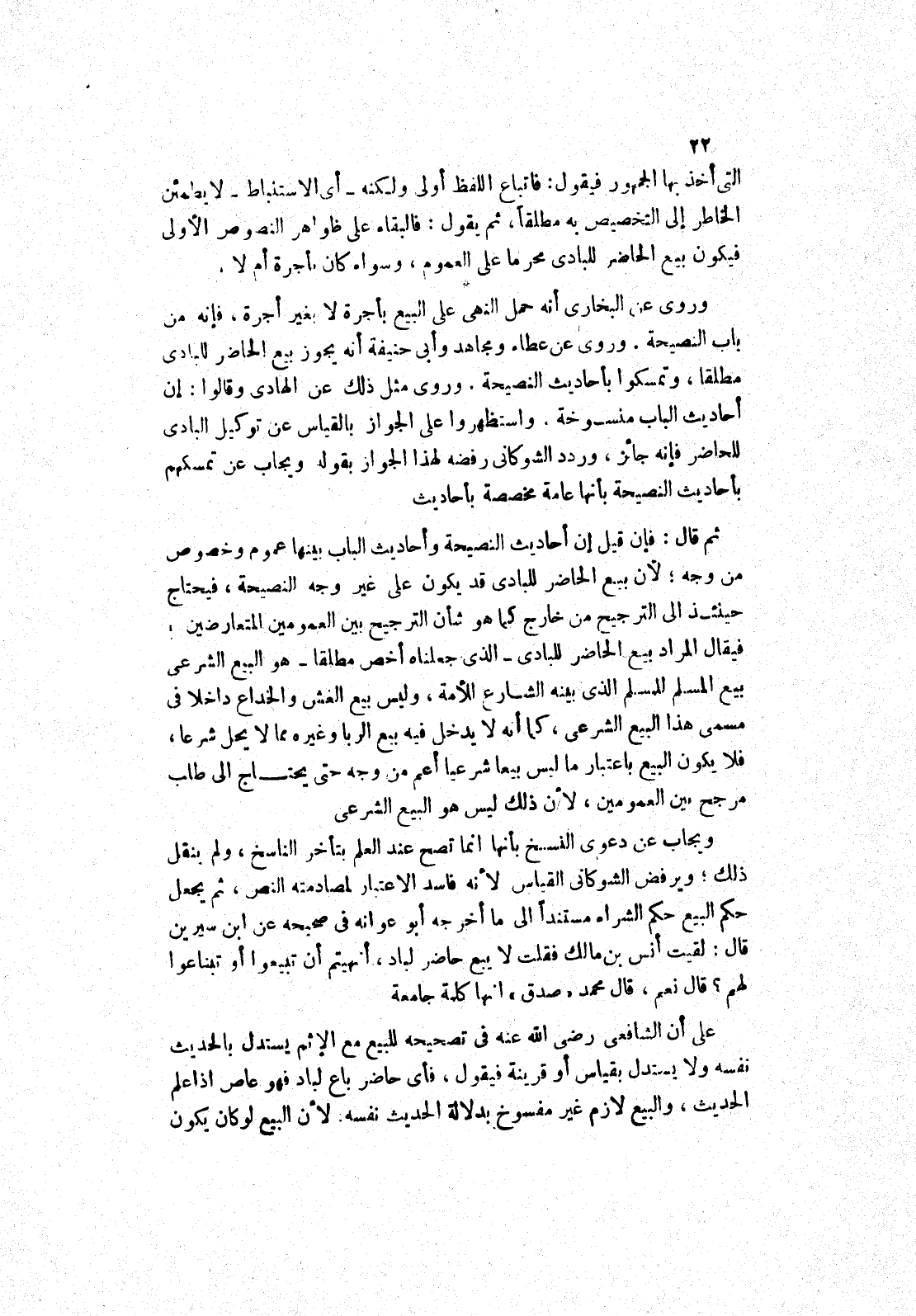 واستظهروا على الجواز بالقياس عن توكيل البادى للحاضر فإنه جائز، وردد الشوكاني رفضه لهذا الجواز بقوله ويجاب عن تمسكهم بأحاديث النصيحة بأنها عامة مخصصة بأحاديث ثم قال: فإن قيل إن أحاديث النصيحة وأحاديث الباب بينها عموم وخصوص من وجه، لان بيع الحاضر للبادى قد يكون على غير وجه النصيحة، فيحتاج حينئذ إلى الترجيح من خارج كما هو شأن الترجيح بين العمومين المتعارضين، فيقال المراد بيع الحاضر للبادى - الذى جعلناه أخص مطلقا - هو البيع الشرعي بيع المسلم للمسلم الذى بينه الشارع للامة، وليس بيع الغش والخداع داخلا في مسمى هذا البيع الشرعي، كما أنه لا يدخل فيه بيع الربا وغيره مما لا يحل شرعا، فلا يكون البيع باعتبار ما ليس بيعا شرعيا أعم من وجه حتى يحتاج إلى طلب مرجح بين العمومين، لان ذلك ليس هو البيع الشرعي ويجاب عن دعوى النسخ بأنها انما تصح عند العلم بتأخر الناسخ، ولم ينقل ذلك، ويرفض الشوكاني القياس لانه فاسد الاعتبار لمصادمته النص، ثم يجعل حكم البيع حكم الشراء مستندا إلى ما أخرجه أبو عوانة في صحيحه عن ابن سيرين قال: لقيت أنس بن مالك فقلت لا يبع حاضر لباد، أنهيتم أن تبيعوا أو تبتاعوا لهم؟ قال نعم، قال محمد " صدق " انها كلمة جامعة على أن الشافعي رضى الله عنه في تصحيحه للبيع مع الاثم يستدل بالحديث نفسه ولا يستدل بقياس أو قرينة فيقول، فأى حاضر باع لباد فهو عاص إذا علم الحديث، والبيع لازم غير مفسوخ بدلالة الحديث نفسه.