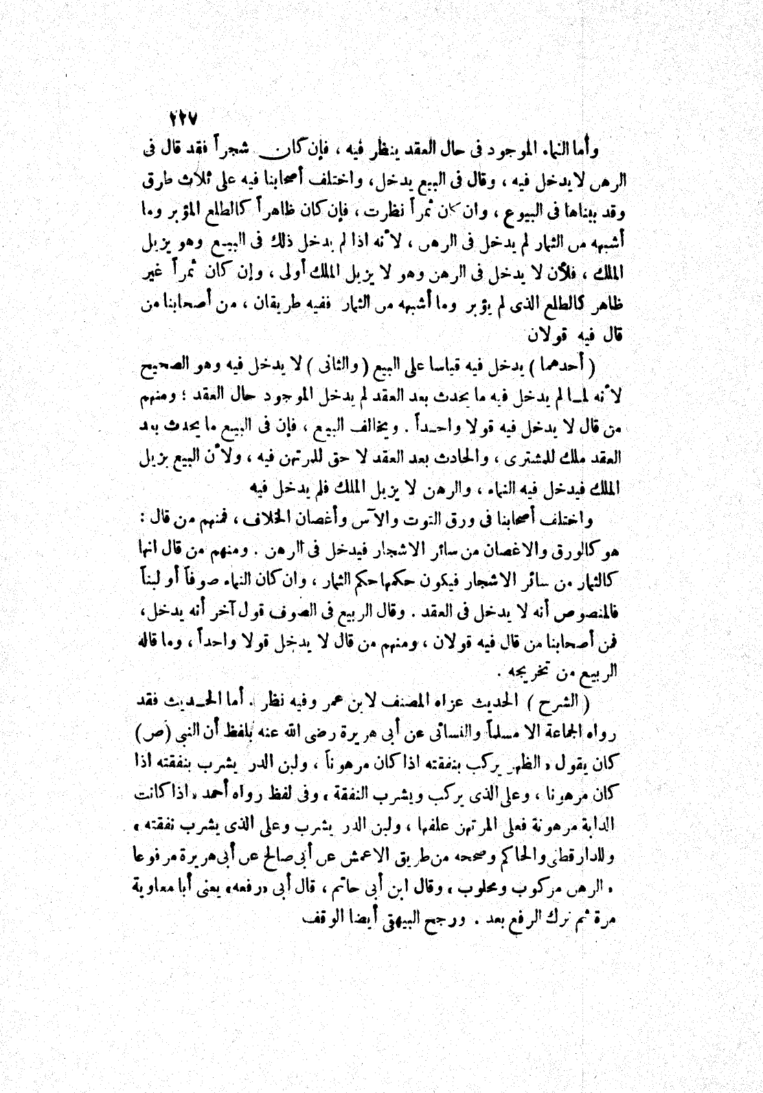 وأما النماء الموجود في حال العقد ينظر فيه، فإن كان شجرا فقد قال في الرهن لا يدخل فيه، وقال في البيع يدخل، واختلف أصحابنا فيه على ثلاث طرق وقد بيناها في البيوع، وان كان ثمرا نظرت، فإن كان ظاهرا كالطلع المؤبر وما أشبهه من الثمار لم يدخل في الرهن، لانه إذا لم يدخل ذلك في البيع وهو يزيل الملك، فلان لا يدخل في الرهن وهو لا يزيل الملك أولى، وإن كان ثمرا غير ظاهر كالطلع الذى لم يؤبر وما أشبهه من الثمار ففيه طَرِيقَانِ، مِنْ أَصْحَابِنَا مِنْ قَالَ فِيهِ قَوْلَانِ