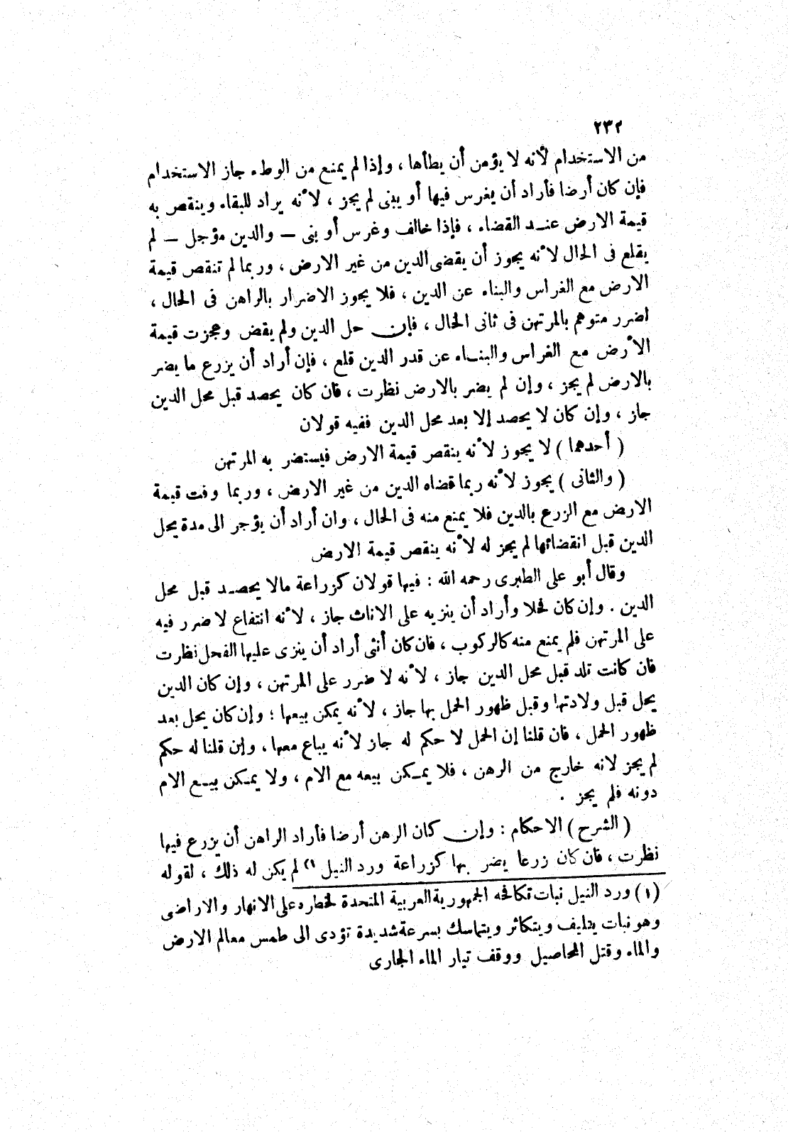 (الشرح) الاحكام، وإن كان الرهن أرضا فأراد الراهن أن يزرع فيها نظرت، فان كان زرعا يضر بها كزراعة ورد النيل (1) لم يكن له ذلك، لقوله