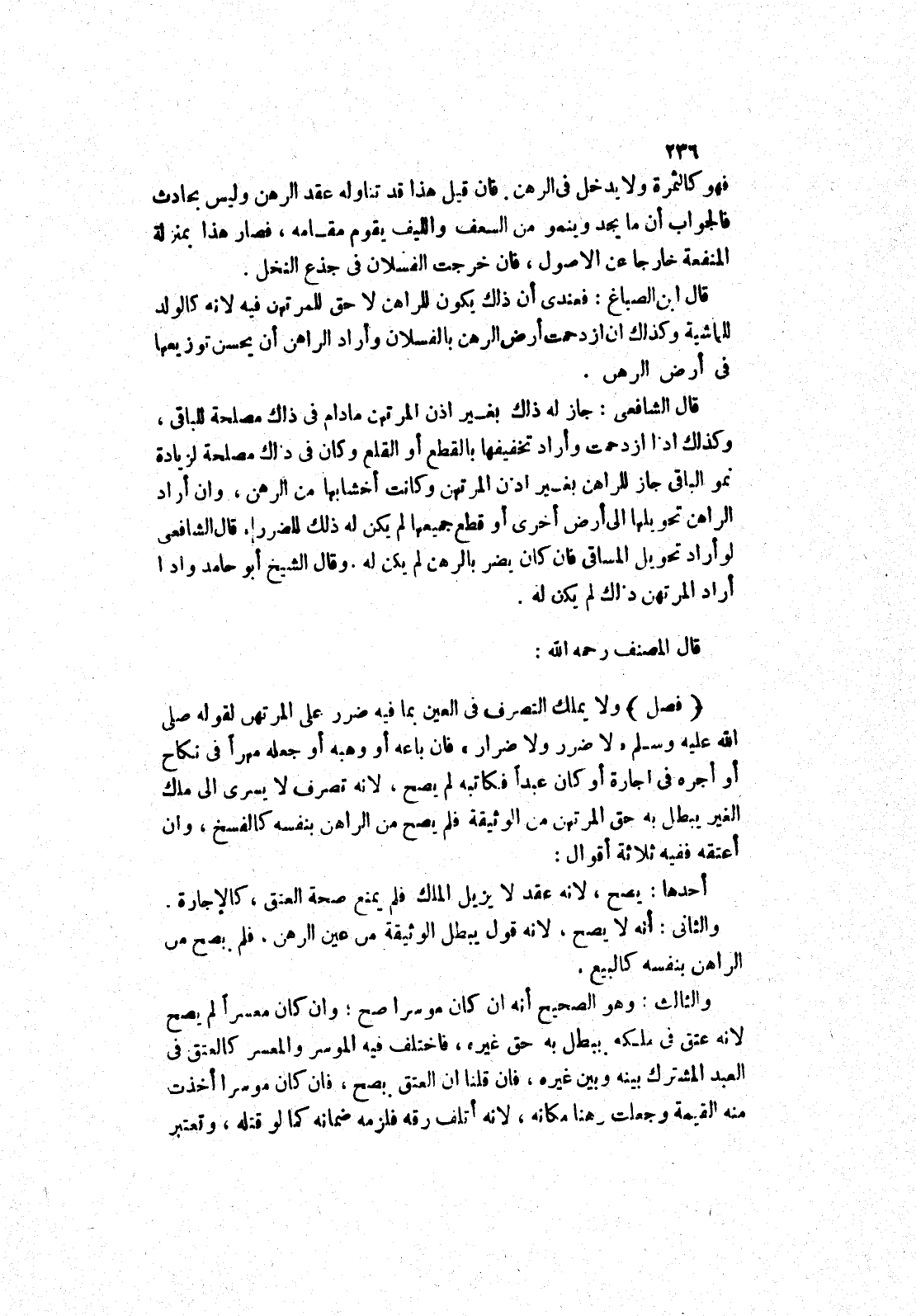 اللَّهُ عَلَيْهِ وَسَلَّمَ " لَا ضَرَرَ وَلَا ضرار " فان باعه أو وهبه أو جعله مهرا في نكاح أو أجره في اجارة أو كان عبدا فكاتبه لم يصح، لانه تصرف لا يسرى إلى ملك الغير يبطل به حق المرتهن من الوثيقة فلم يصح من الراهن بنفسه كالفسخ، وان أعتقه ففيه ثلاثة أقوال: أحدها: يصح، لانه عقد لا يزيل الملك فلم يمنع صحة العتق، كالاجارة.