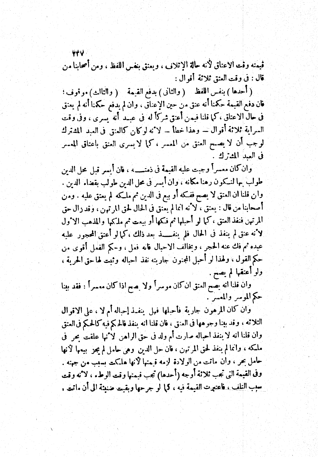 بدفع القيمة (والثالث) موقوف، فان دفع القيمة حكمنا أنه عتق من حين الاعتاق، وان لم يدفع حكمنا أنه لم يعتق في حال الاعتاق، كما قلنا فيمن أعتق شركا له في عبد أنه يسرى، وفى وقت السراية ثلاثة أقوال - وهذا خطأ - لانه لو كان كالعتق في العبد المشترك لوجب أن لا يصح العتق من المعسر، كما لا يسرى العتق باعتاق المعسر في العبد المشترك.