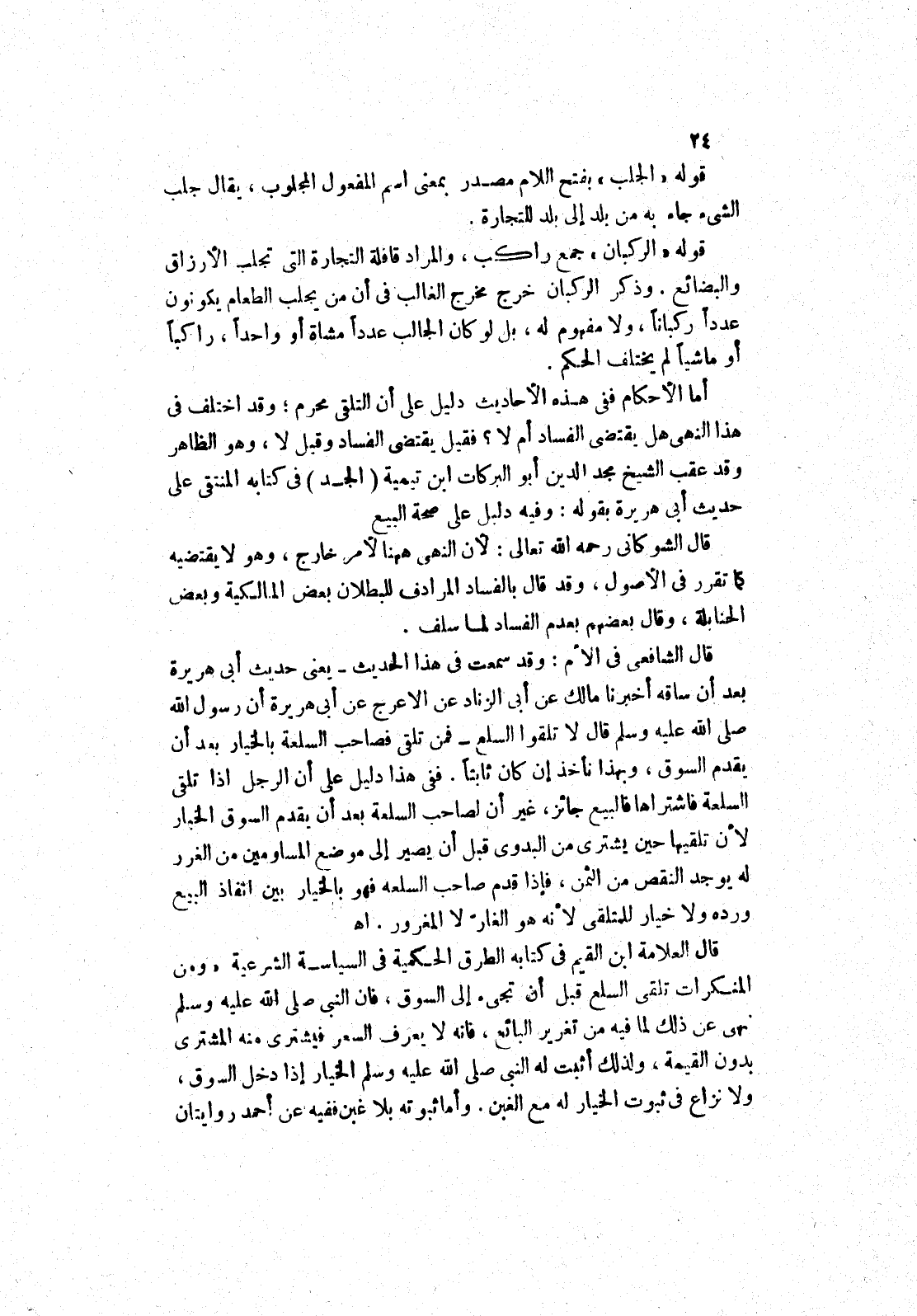 اه قال العلامة ابن القيم في كتابه الطرق الحكمية في السياسة الشرعية " ومن المنكرات تلقى السلع قبل أن تجئ إلى السوق، فان النبي صلى عليه وسلم نهى عن ذلك لما فيه من تغرير البائع، فانه لا يعرف السعر فيشترى منه المشترى بدون القيمة، ولذلك أثبت لَهُ النَّبِيُّ صَلَّى اللَّهُ عَلَيْهِ وَسَلَّمَ الْخِيَارَ إذا دخل السوق، ولا نزاع في ثبوت الخيار له مع الغبن.