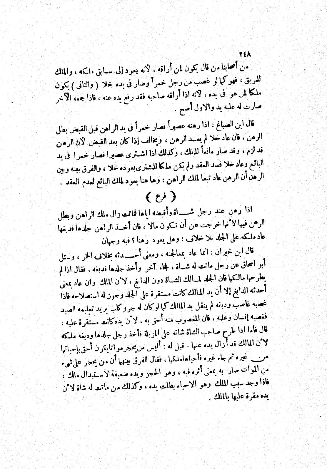 قال ابن الصباغ: إذا رهنه عصيرا فصار خمرا في يد الراهن قبل القبض بطل الرهن، فان عاد خلا لم يعد الرهن، ويخالف إذا كان بعد القبض لان الرهن قد لزم، وقد صار مانعا للملك، وكذلك إذا اشترى عصيرا فصار خمرا في يد البائع وعاد خلا فسد العقد ولم يكن ملكا للمشترى بعوده خلا، والفرق بينه وبين الرهن أن الرهن عاد تبعا لملك الراهن، وها هنا يعود لملك البائع لعدم العقد.