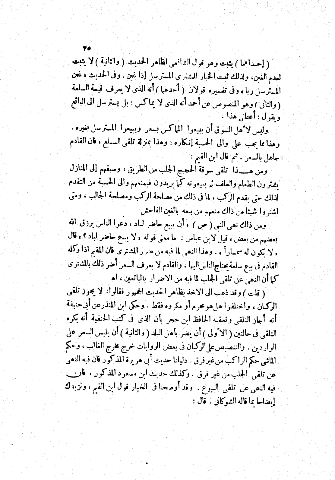 ثم قال ابن القيم: ومن هذا تلقى سوقة الحجيج الجلب من الطريق، وسبقهم إلى المنازل يشترون الطعام والعلف ثم يبيعونه كما يريدون فيمنعهم والى الحسبة من التقدم لذلك حتى يقدم الركب، لما في ذلك من مصلحة الركب ومصلحة الجالب، ومتى اشتروا شيئا من ذلك منعهم من بيعه بالغبن الفاحش ومن ذلك نَهَى النَّبِيُّ صَلَّى اللَّهُ عَلَيْهِ وَسَلَّمَ " أَنْ يبيع حاضر لباد، دعوا الناس يرزق الله بعضهم من بعض " قيل لابن عباس: ما معنى قوله " لا يبيع حاضر لباد؟ " قال " لا يكون له سمسارا ".
