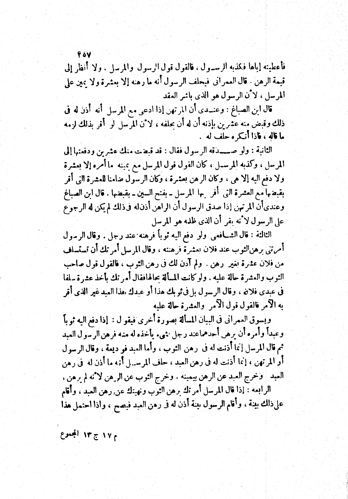 قال ابن الصباغ وعندي أن المرتهن إذا صدق الرسول أن الراهن أذن له في ذلك لم يكن له الرجوع على الرسول لانه يقر أن الذى ظلمه هو المرسل الثالثة: قال الشافعي ولو دفع إليه ثوبا فرهنه عند رجل.