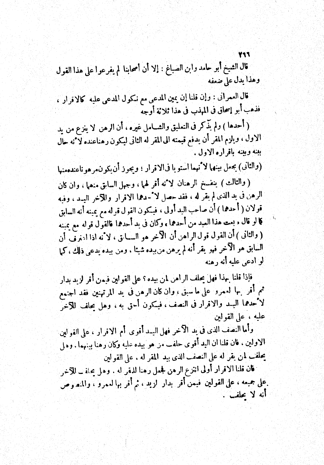 قال الشيخ أبو حامد وابن الصباغ: إلا أن أصحابنا لم يفرعوا على هذا القول وهذا يدل على ضعفه قال العمرانى: وإن قلنا إن يمين المدعى مع نكول المدعى على كالاقرار، فذهب أبو إسحاق في المهذب في هذا ثلاثة أوجه (أحدها) ولم يذكر في التعليق والشامل غيره، أن الرهن لا ينزع من يد الاول، ويلزم المقر أن يدفع قيمته إلى المقر له الثاني ليكون رهنا عنده لانه حال بينه وبينه باقراره الاول.