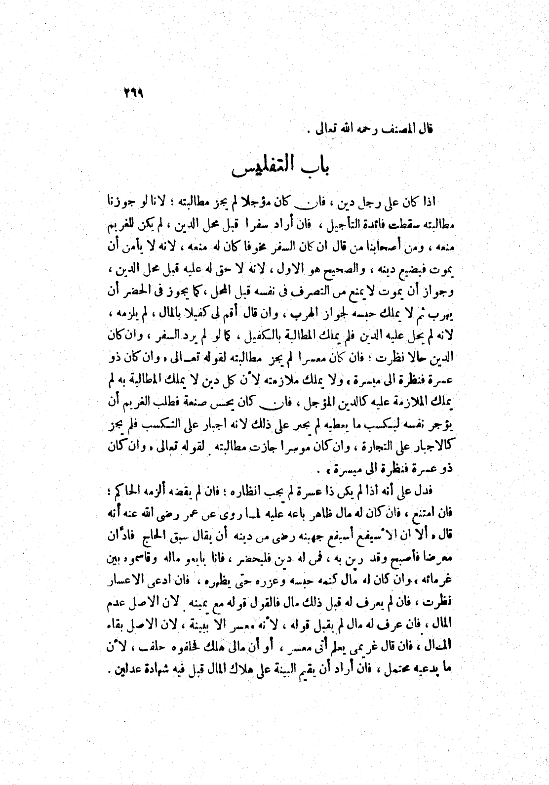 إذا كان على رجل دين، فان كان مؤجلا لم يجز مطالبته، لانا لو جوزنا مطالبته سقطت فائدة التأجيل، فان أراد سفرا قبل محل الدين، لم يكن للغريم منعه، ومن أصحابنا من قال ان كان السفر مخوفا كان له منعه، لانه لا يأمن أن يموت فيضيع دينه، والصحيح هو الاول، لانه لا حق له عليه قبل محل الدين، وجواز أن يموت لا يمنع من التصرف في نفسه قبل المحل، كما يجوز في الحضر أن يهرب ثم لا يملك حبسه لجواز الهرب، وان قال أقم لى كفيلا بالمال، لم يلزمه، لانه لم يحل عليه الدين فلم يملك المطالبة بالكفيل، كما لو لم يرد السفر، وان كان الدين حالا نظرت، فان كان معسرا لم يجز مطالبته لقوله تعالى " وان كان ذو عسرة فنظرة إلى ميسرة " ولا يملك ملازمته لان كل دين لا يملك المطالبة به لم يملك الملازمة عليه كالدين المؤجل، فان كان يحسن صنعة فطلب الغريم أن يؤجر نفسه ليكسب ما يعطيه لم يجبر على ذلك لانه اجبار على التكسب فلم يجز كالاجبار على التجارة، وان كان موسرا جازت مطالبته.