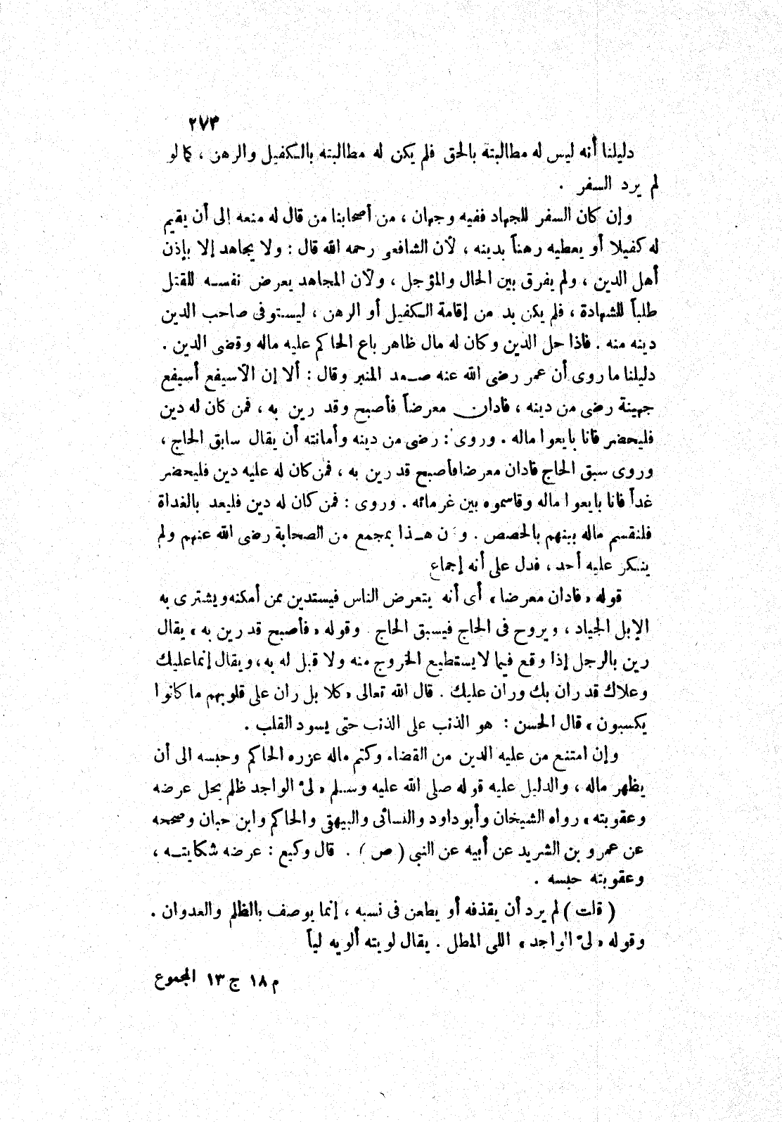 وإن كان السفر للجهاد ففيه وجهان، من أصحابنا من قال له منعه إلى أن يقيم له كفيلا أو يعطيه رهنا بدينه، لان الشافعي رحمه الله قال: ولا يجاهد إلا بإذن أهل الدين، ولم يفرق بين الحال والمؤجل، ولان المجاهد يعرض نفسه للقتل