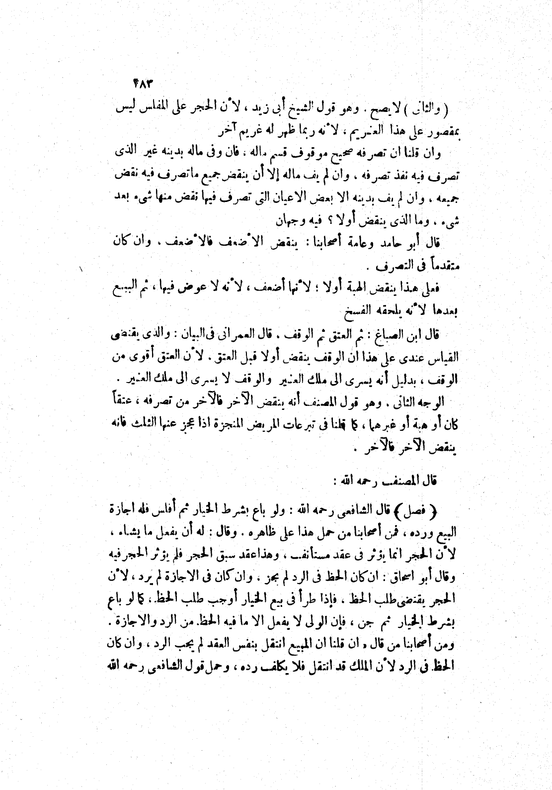 وهو قول الشيخ أبى زيد، لان الحجر على المفلس ليس بمقصور على هذا الغريم، لانه ربما ظهر له غريم آخر وان قلنا ان تصرفه صحيح موقوف قسم ماله، فان وفى ماله بدينه غير الذى تصرف فيه نفذ تصرفه، وان لم يف ماله إلا أن ينقض جميع ما تصرف فيه نقض جميعه، وان لم يف بدينه الا بعض الاعيان التى تصرف فيها نقض منها شئ بعد شئ، وما الذى ينقض أولا؟ فيه وجهان قال أبو حامد وعامة أصحابنا: ينقض فالاضعف، وان كان متقدما في التصرف.
