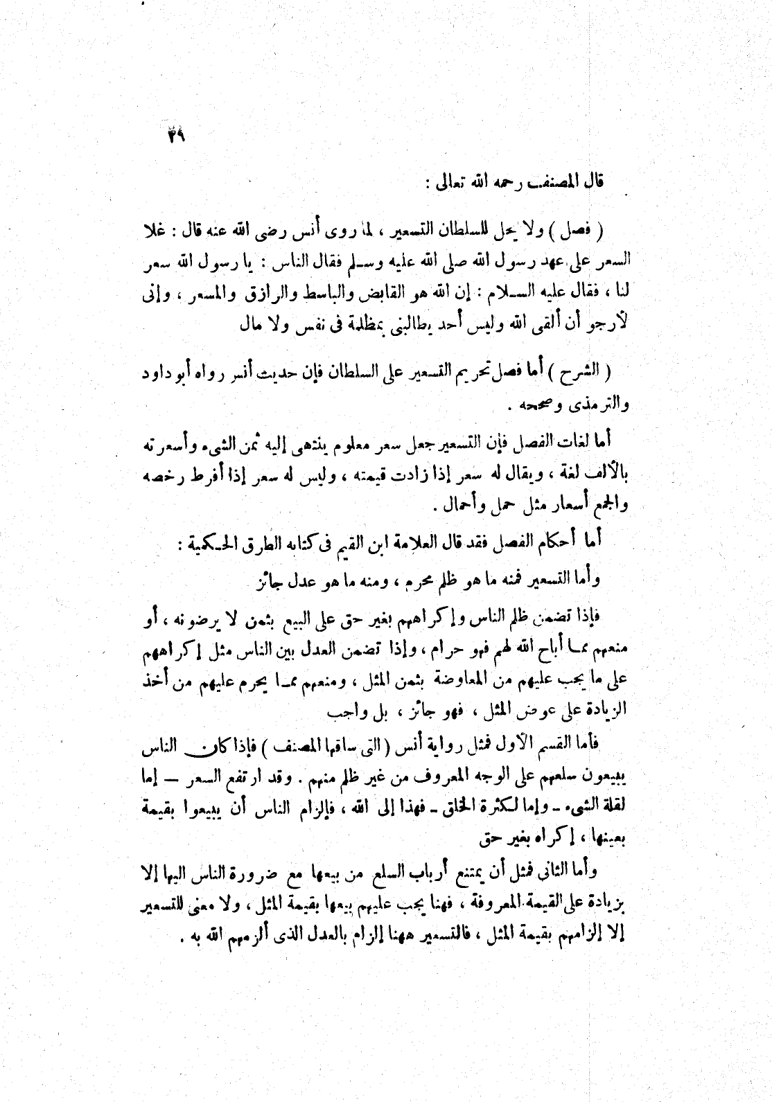 أما أحكام الفصل فقد قال العلامة ابن القيم في كتابه الطرق الحكمية: وأما التسعير فمنه ما هو ظلم محرم، ومنه ما هو عدل جائز فإذا تضمن ظلم الناس وإكراههم بغير حق على البيع بثمن لا يرضونه، أو منعهم مما أباح الله لهم فهو حرام، وإذا تضمن العدل بين الناس مثل إكراههم على ما يجب عليهم من المعاوضة بثمن المثل، ومنعهم مما يحرم عليهم من أخذ الزيادة على عوض المثل، فهو جائز، بل واجب فأما القسم الاول فمثل رواية أنس (التى ساقها المصنف) فإذا كان الناس يبيعون سلعهم على الوجه المعروف من غير ظلم منهم.