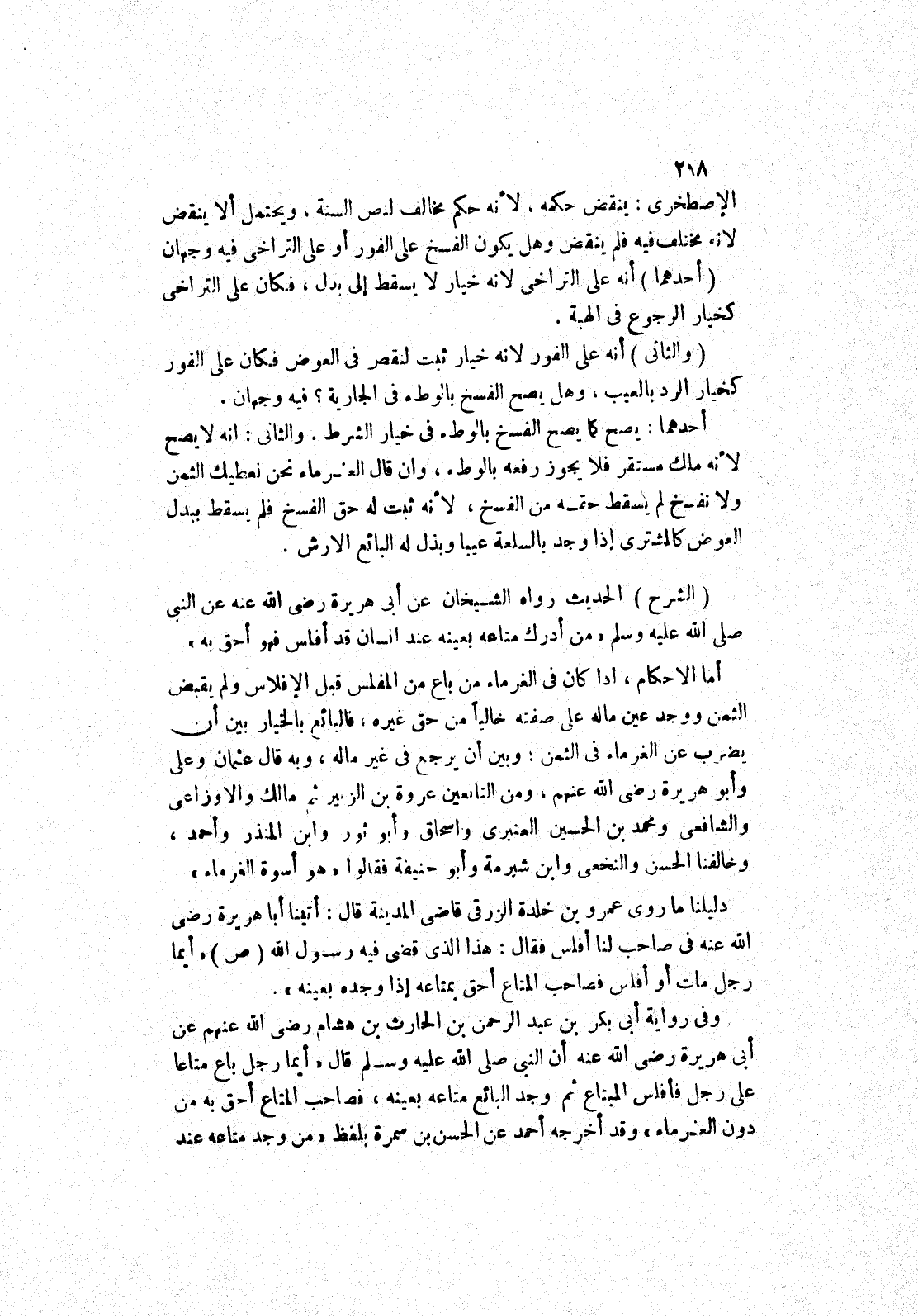 (الشرح) الحديث رواه الشيخان عَنْ أَبِي هُرَيْرَةَ رَضِيَ اللَّهُ عَنْهُ عَنْ النَّبِيِّ صلى الله عليه وسلم " من أدرك متاعه بعينه عند انسان قد أفلس فهو أحق به " أما الاحكام، إذا كان في الغرماء من باع من المفلس قبل الافلاس ولم يقبض الثمن ووجد عين ماله على صفته خاليا من حق غيره، فالبائع بالخيار بين أن يضرب عن الغرماء في الثمن، وبين أن يرجع في غير ماله، وبه قال عثمان وعلى وأبو هريرة رضى الله عنهم، ومن التابعين عروة بن الزبير ثم مالك والاوزاعي والشافعي ومحمد بن الحسين العنبري واسحاق وأبو ثور وابن المنذر وأحمد، وخالفنا الحسن والنخعي وابن شبرمة وأبو حنيفة فقالوا " هو اسوة الغرماء " دليلنا ما روى عمرو بن خلدة الزرقى قاضى المدينة قال: أتينا أبا هريرة رضى