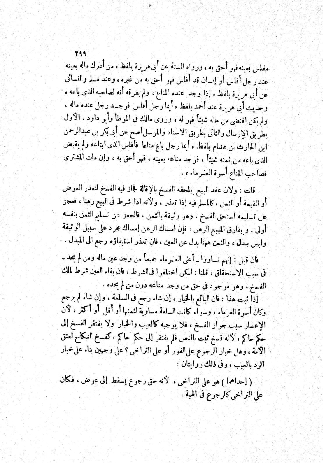 مفلس بعينه فهو أحق به " ورواه الستة عن أبى هريرة بلفظ " من أدرك ماله بعينه عند رجل أفلس أو إنسان قد أفلس فهو أحق به من غيره " وعند مسلم والنسائي عن أبى هريرة بلفظ " إذا وجد عنده المتاع، ولم يفرقه أنه لصاحبه الذى باعه " وحديث أبى هريرة عند أحمد بلفظ " أيما رجل أفلس فوجد رجل عنده ماله، ولم يكن اقتضى من ماله شيئا فهو له " وروى مالك في الموطأ وأبو داود، الاول بطريق الارسال والثانى بطريق الاسناد والمرسل اصح عن أبى بكر بن عبد الرحمن ابن الحارث بن هشام بلفظ " أيما رجل باع متاعا فأفلس الذى ابتاعه ولم يقبض الذى باعه من ثمنه شيئا، فوجد متاعه بعينه، فهو أحق به، وإن مات المشترى فصاحب المتاع أسوة الغرماء ".